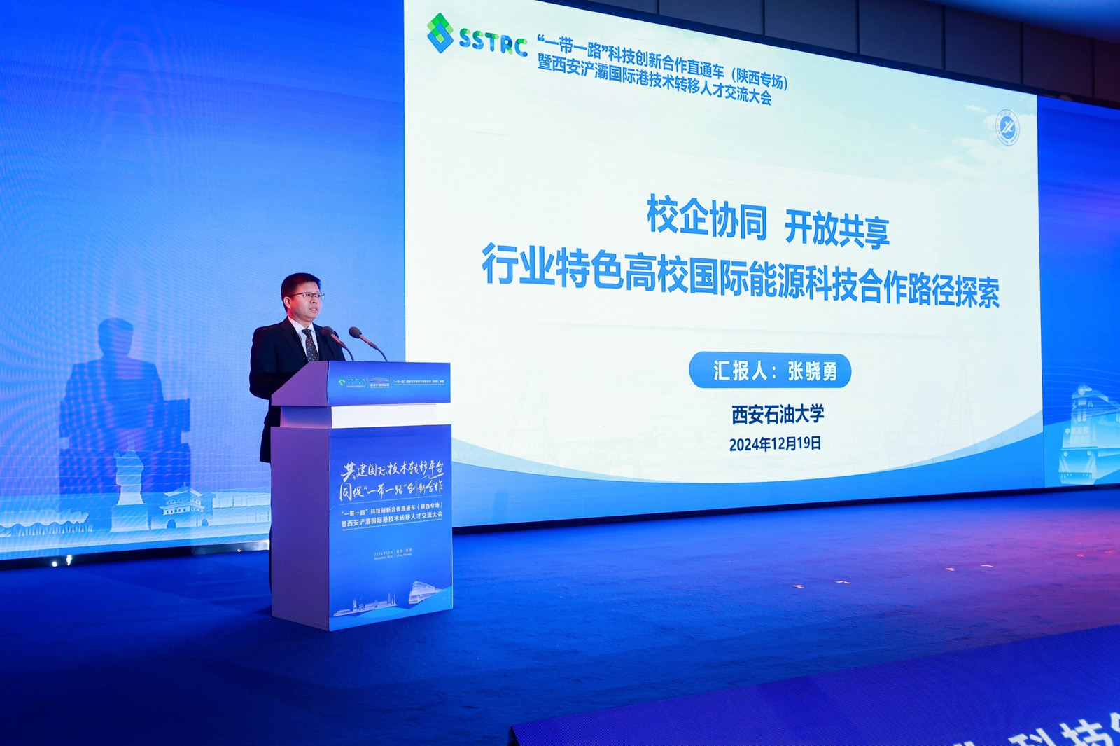 12月19日,由陕西省科技资源统筹中心与西安浐灞国际港管理委员会主办,西安科技大市场有限公司承办,beat365官网与西安交通大学、西北工业大学等多家单位联合协办的“一带一路”科技创新合作直通车(陕西专场)暨西安浐灞国际港技术转移人才交流大会在西安举办。beat365官网副校长张骁勇应邀出席大会,并做了题为《校企协同开放共享,行业特色高校国际能源科技合作路径探索》的报告,科研处、国际合作与交流处相关负责人陪同参会。