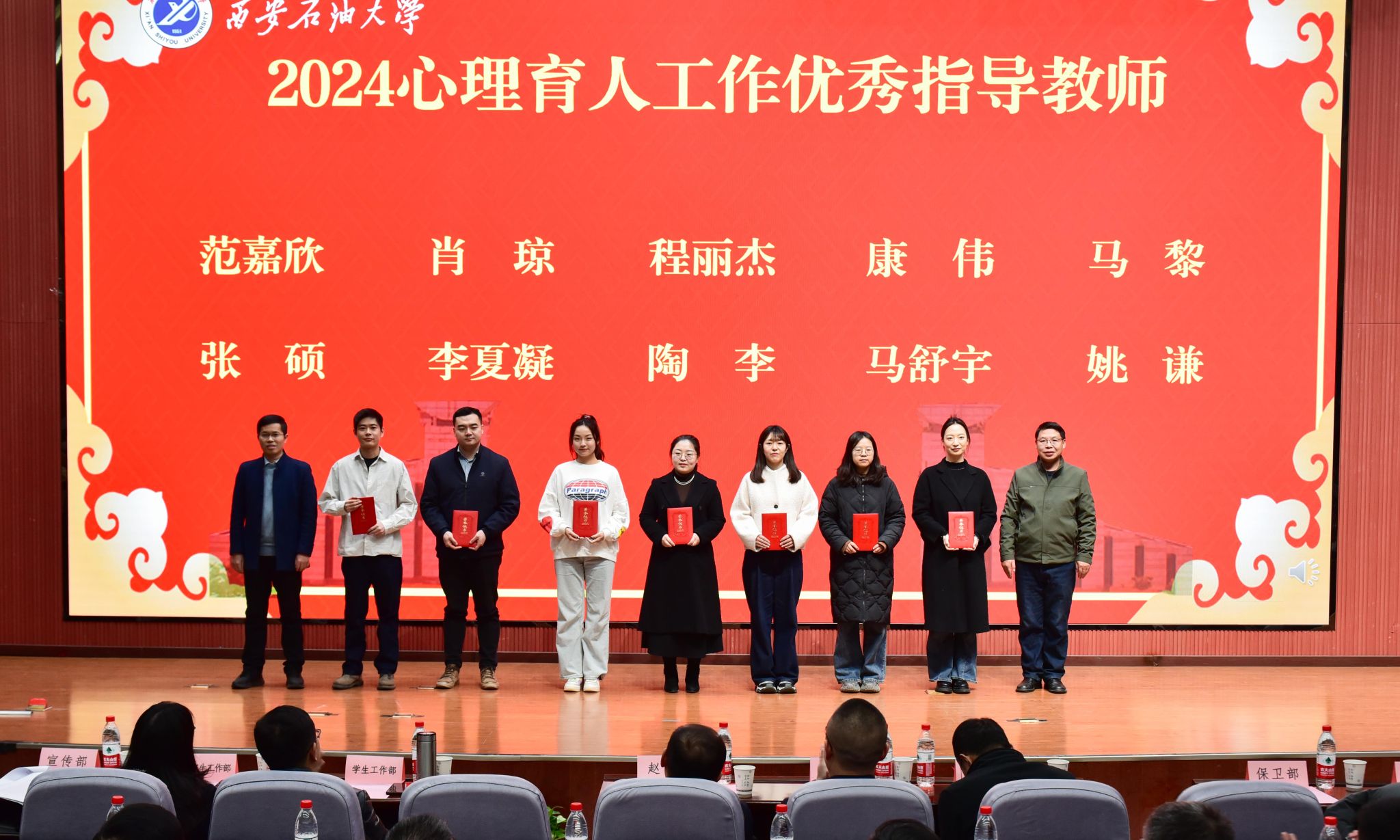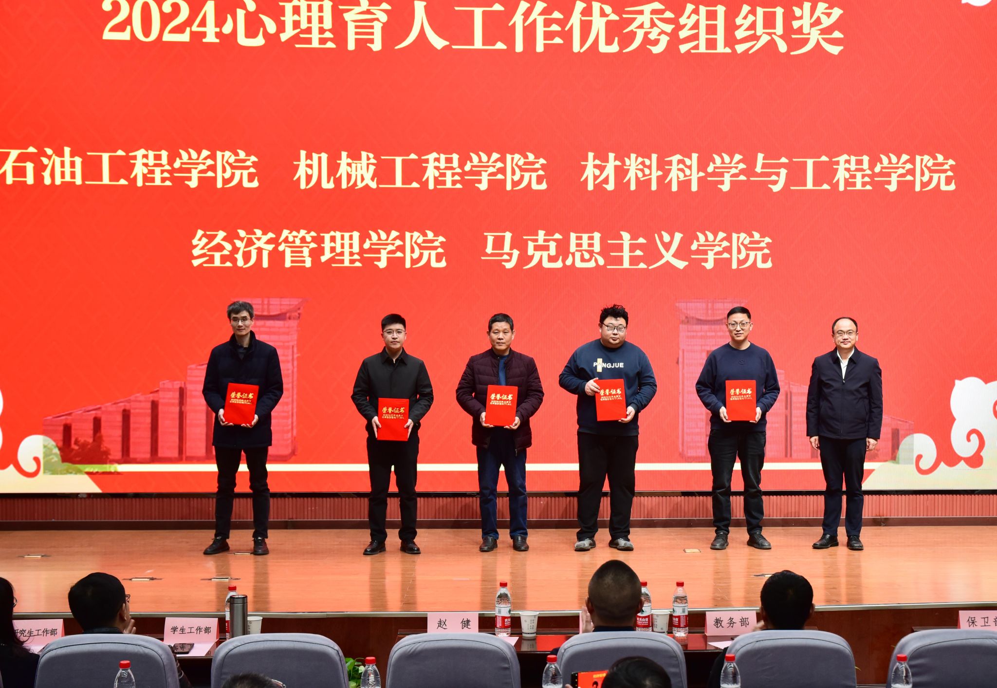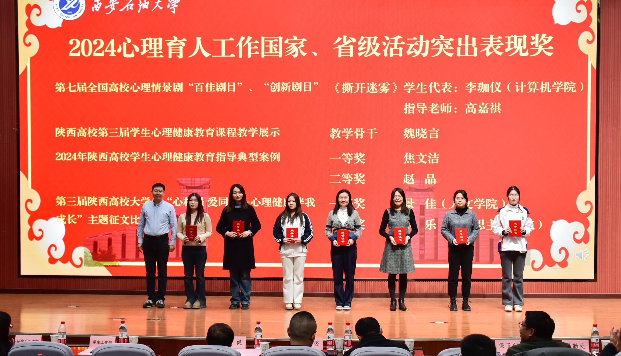 学生工作部部长王亮宣读了beat365官网师生在2024年国家、省级心理健康教育工作中的获奖情况以及《关于beat365正版唯一官网2024心理育人工作先进单位和个人的表彰决定》。与会领导为获奖个人及集体颁奖。