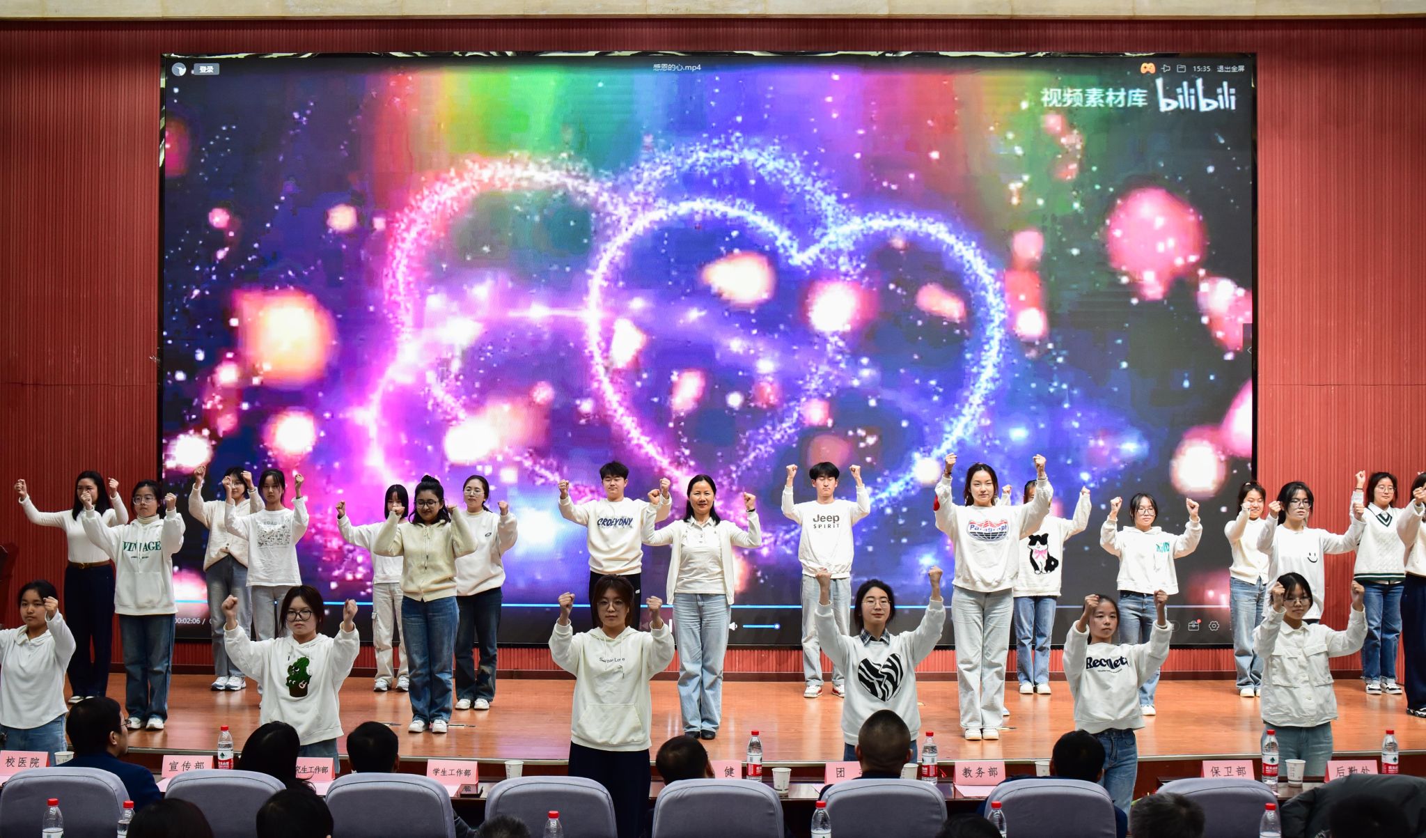 会间,2024年心理育人优秀实践作品的部分成果,通过视频展播和现场展示的方式,向大家进行了汇报。材料类2401班心理委员白雨涵现场展示了“朋辈互助 友爱班级”心理健康教育主题班会一等奖作品《友爱互助 从心出发——人际关系你、我、TA》。通过视频,现场展播了“心情故事 灵动主角”校园心理情景剧一等奖、石油工程学院作品《重启的轨迹》以及《心理健康教育》课程推荐的优秀工作坊作品、计算机学院计类2301/2302作品《优等生》。汇报表彰会在由学生心理成长指导中心教师、院系心理专干,大学生心理协会、心理委员联合协会代表表演的手语舞《感恩的心》中落下帷幕。