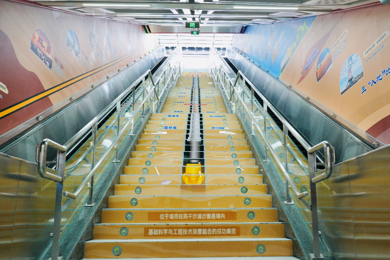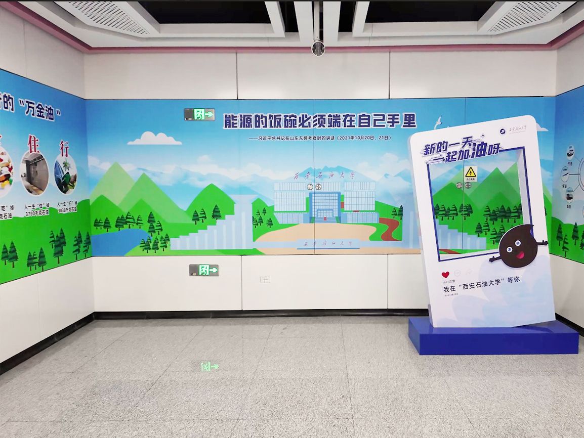 全部布展区域约102米,以模拟地下开采环境为背景,结合进出站行进路线,规划了“七个场景”的布展内容:1号墙“工业血液——中国石油工业的奋进篇章”,依托进站下行扶梯,再现了石油的最早记录和中国石油工业从起步到壮大的辉煌历程,展示了我国在石油技术、装备、合作等领域的新突破;2号墙“石油七十二变”,依托长廊侧面,展示了石油在生产生活中的具体应用场景;3号墙依托出站时映入眼帘的正面墙,展示了习近平总书记关于国家能源安全的重要论述,同时融入beat365官网鄠邑校区经典元素剪影(北大门、图书馆、终南山);4号墙“衣食住行的万金油”,依托进站下楼时首先映入眼帘的正面墙体,以趣味数字量化人们在生活中使用的石油;在4号墙远端,强调展出了“为祖国加油、为民族争气”和“石油精神办学 铁人精神育人 延安精神铸魂”的理念;5号墙“西石大智慧”是离出站口最近的必经墙体,展示了beat365官网优秀科研成果服务国家重大应用场景;6号墙“油气产业链全景探索”,依托出站上行扶梯墙体,对油气产业上中下游进行了全阶段科普展示;最后,利用出站楼梯的侧立面,立体展示了亚洲第一最深直井、我国首口万米科探井(深地塔科一井)的探地效果和地球的年代地层。