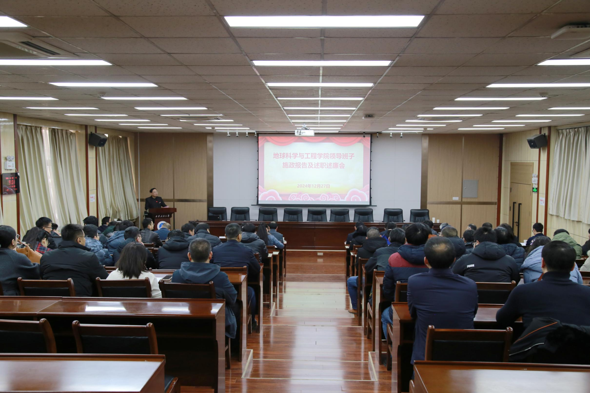 12月27日上午,校长王进富在雁塔校区西阶会议中心第五会议室出席了地球科学与工程学院新领导班子发展思路与行动计划宣讲会及述职述廉大会,党委办公室(校长办公室)、党委组织部(党校)、党委学生工作部、党委教师工作部、发展规划处、研究生院、科研处(科研成果转移转化中心)等相关部门领导,学院领导班子和全体教职员工参加会议。