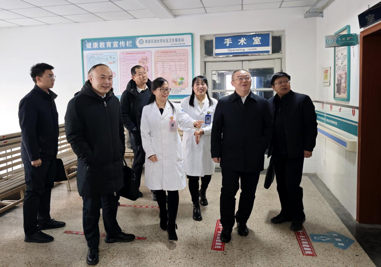 常江一行到雁塔校区校医院现场考察了门诊部、住院部、公卫科、防保科等医疗场所。每到一处,他都仔细询问各项业务的运行状况,并强调指出,校医院的工作责任重大,关系到全校师生的健康,必须坚持人民至上的理念,认真做好服务保障工作,为师生提供优质的医疗服务,切实提高大家的就医体验感。