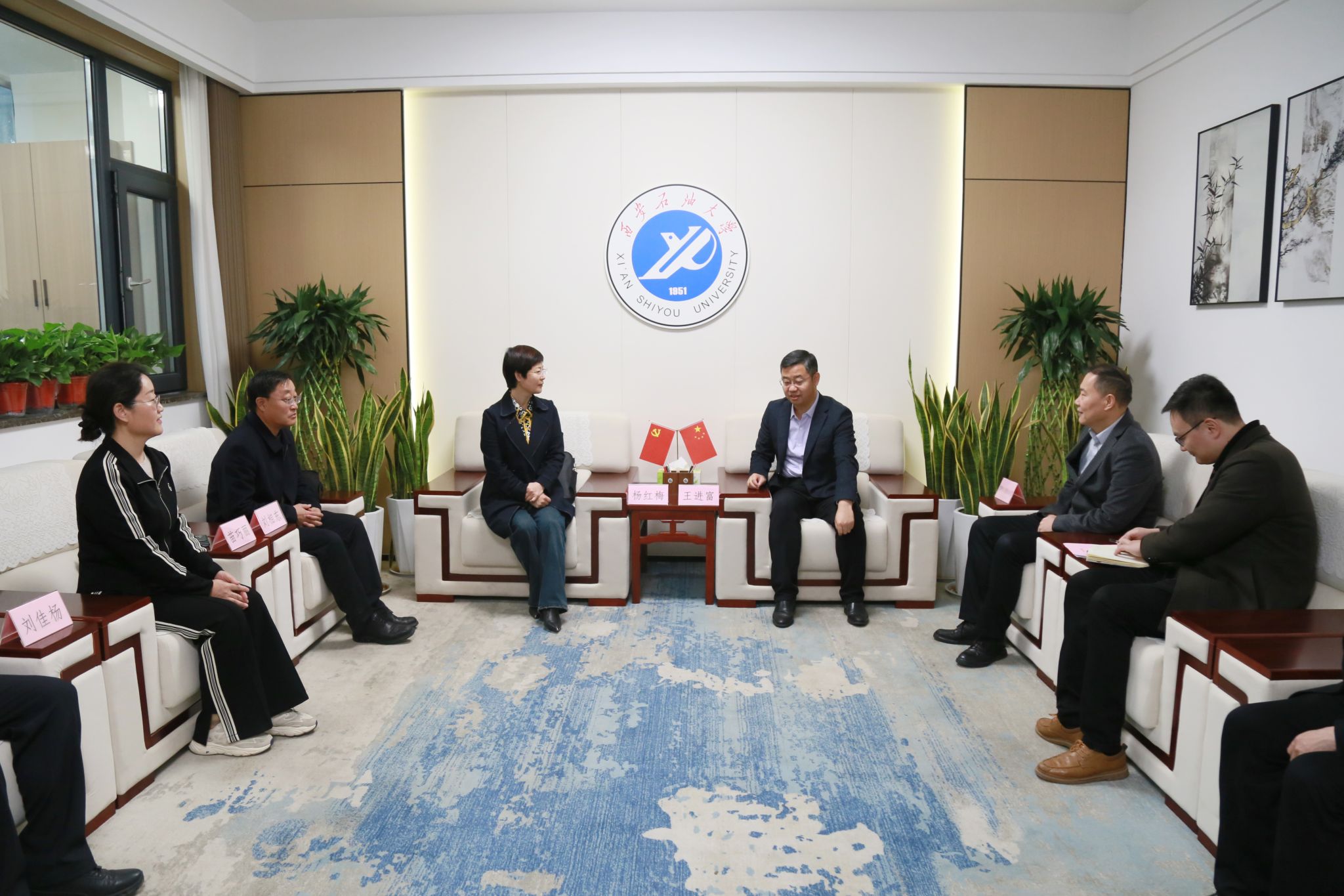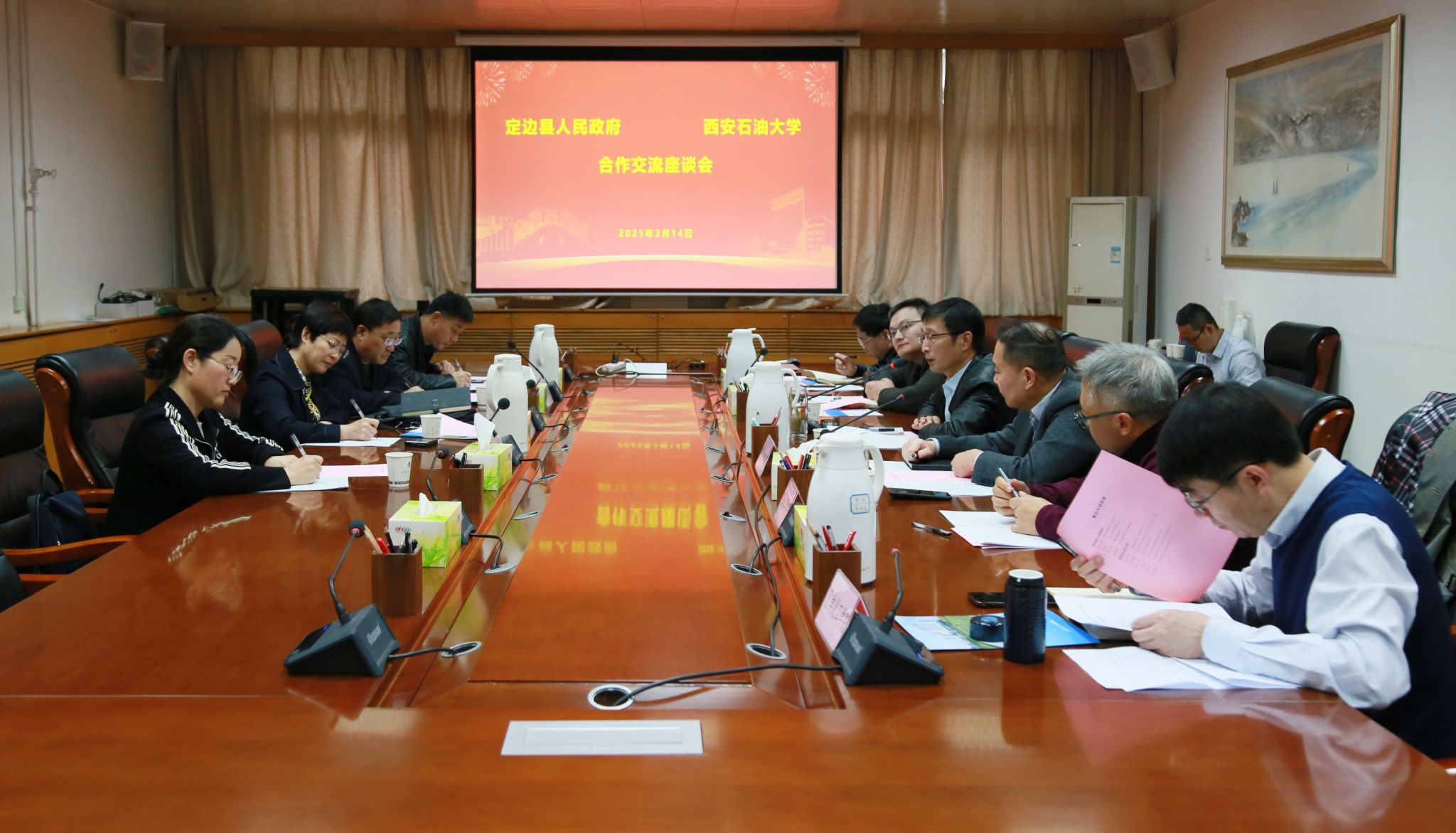 座谈会上,苏文甫对杨红梅一行来访表示热烈欢迎,对近年来定边县取得的成绩表示祝贺,并简要介绍了学校的办学历史、科学研究、学科建设、人才培养等方面情况。他谈到,学校立足陕西,面向西北,服务全国,肩负着服务地方经济和能源行业发展的重任。近年来,学校勇于革新,坚持秉承开放办学的理念,着力加强构建与地方和企业的深度合作,积极鼓励科研人员深入现场一线,从实际生产现场中挖掘课题,切实解决地方与企业的真问题,不断提升学校科研成果的转化应用,为地方产业升级和区域经济发展提供有力支撑。他希望,校地双方充分发挥各自优势,拓宽合作领域,加大合作力度,探索合作新途径、构建合作新机制、打造合作新载体,打通产学研用最先一公里和最后一公里,开创全方位、全链条、全过程的校地合作新局面,共同为国家能源体系建设和社会经济高质量发展作出积极贡献。
