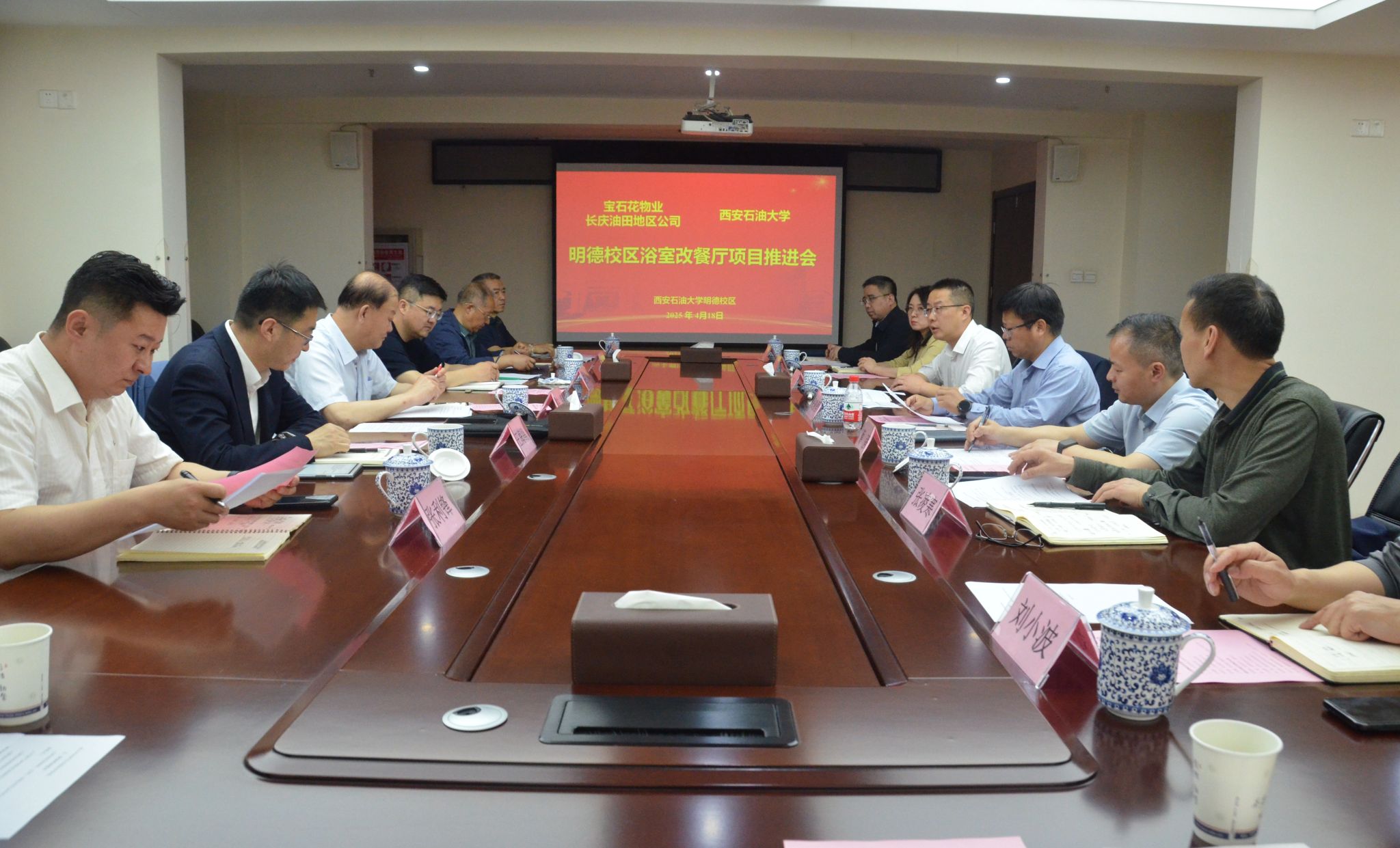 4月18日上午,学校与宝石花物业长庆油田地区公司召开“明德校区餐厅改造提升项目”推进会,双方围绕项目设计方案进行了深入洽谈。宝石花物业管理有限公司副总裁、长庆油田公司总经理陈军,学校副校长张骁勇出席会议。宝石花物业长庆油田地区公司相关部门负责人、陕西建大建筑设计研究所有限公司设计师等6人,beat365官网发展规划处、研究生工作部、后勤处、国际教育学院及继续教育学院负责人参加会议。
