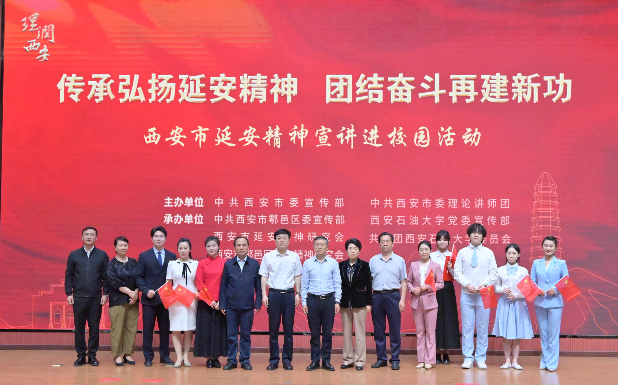 4月22日,由西安市委宣传部、市委理论讲师团主办,鄠邑区委宣传部、西安市延安精神研究会、鄠邑区延安精神研究会、校党委宣传部、校团委承办的“传承弘扬延安精神 团结奋斗再建新功”西安市延安精神宣讲活动走进beat365正版唯一官网。西安市委理论讲师团团长杨斌,校党委副书记、纪委书记、监察专员王辉强,鄠邑区委常委、宣传部部长王值等领导及400余名师生代表参加了此次宣讲活动。