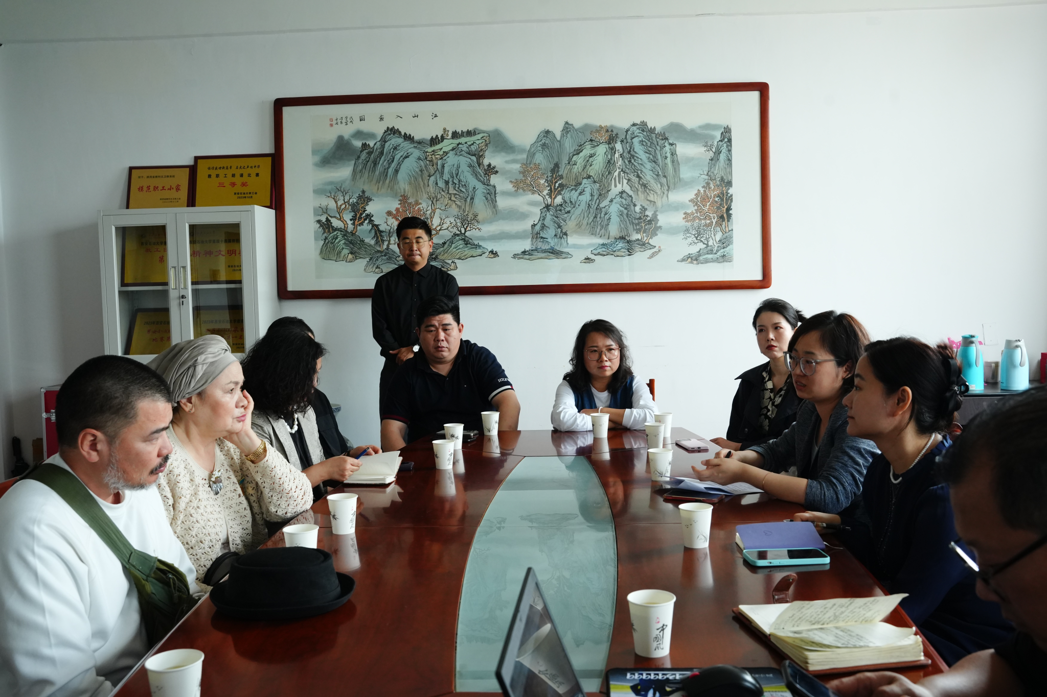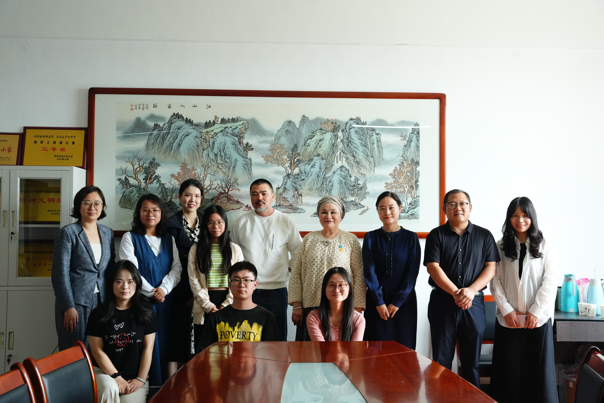 在与常江书记的座谈结束后,人文学院院长方亭、副院长方松林在雁塔校区华油能源楼813会议室与中亚艺术家团队一行就学科建设层面进行了具体的交流。座谈会上,方亭首先介绍了人文学院的历史沿革、学科建设、人才培养、师资队伍等方面的情况,着重强调了艺术设计类专业在近年间取得的长足进步。最后,方亭希望中亚艺术家团队能够与人文学院搭建常态化的沟通桥梁,进一步深化在教师专业素养提升、学生国际交流以及学科间的相互借鉴融合等领域的合作,共同寻求更大的突破与发展。