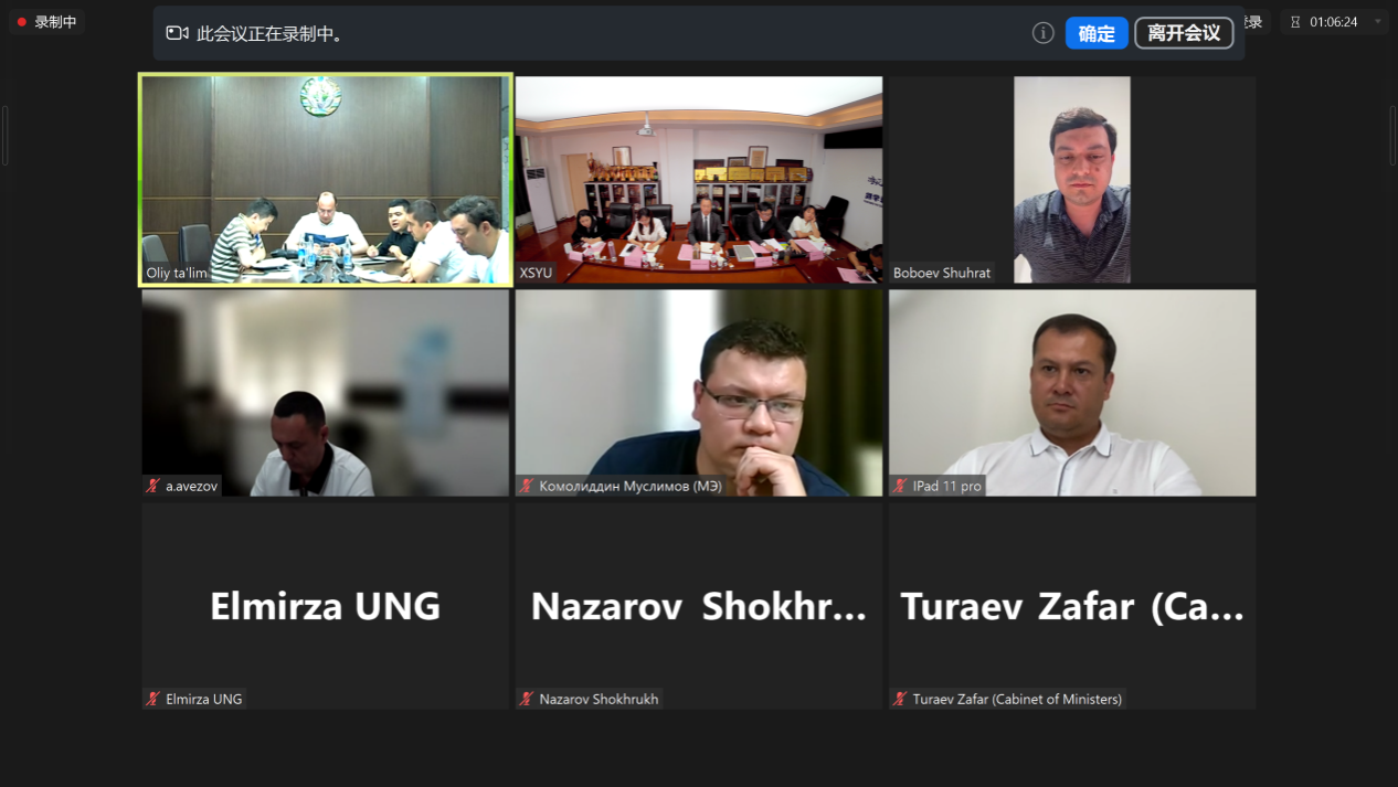 5月10日下午西石大乌兹别克斯坦分校建设第三次工作推进会在雁塔校区东方石油楼801举行,会议以视频方式进行。乌兹别克斯坦高等教育、科学与创新部副部长马卡莫夫·奥塔别克·穆赫托罗维奇,内阁办公厅首席专家图拉耶夫·扎法尔·卡赫拉莫诺维奇,能源部人力资源开发与管理司司长法伊济耶夫·齐约杜拉·纳斯鲁拉耶维奇,能源部国际合作、评级与赠款引进司司长穆赫布博夫·马克苏德别克·诺济姆忠·乌格里,高等教育、科学与创新部教育机构许可与质量保障司司长阿迪佐夫·桑扎尔,高等教育、科学与创新部国际合作与评级管理处处长约济耶夫·戈利布忠,高等教育、科学与创新部国际司首席专家纳扎罗夫·肖赫鲁赫别克出席会议,会议由beat365官网副校长张荣军主持。