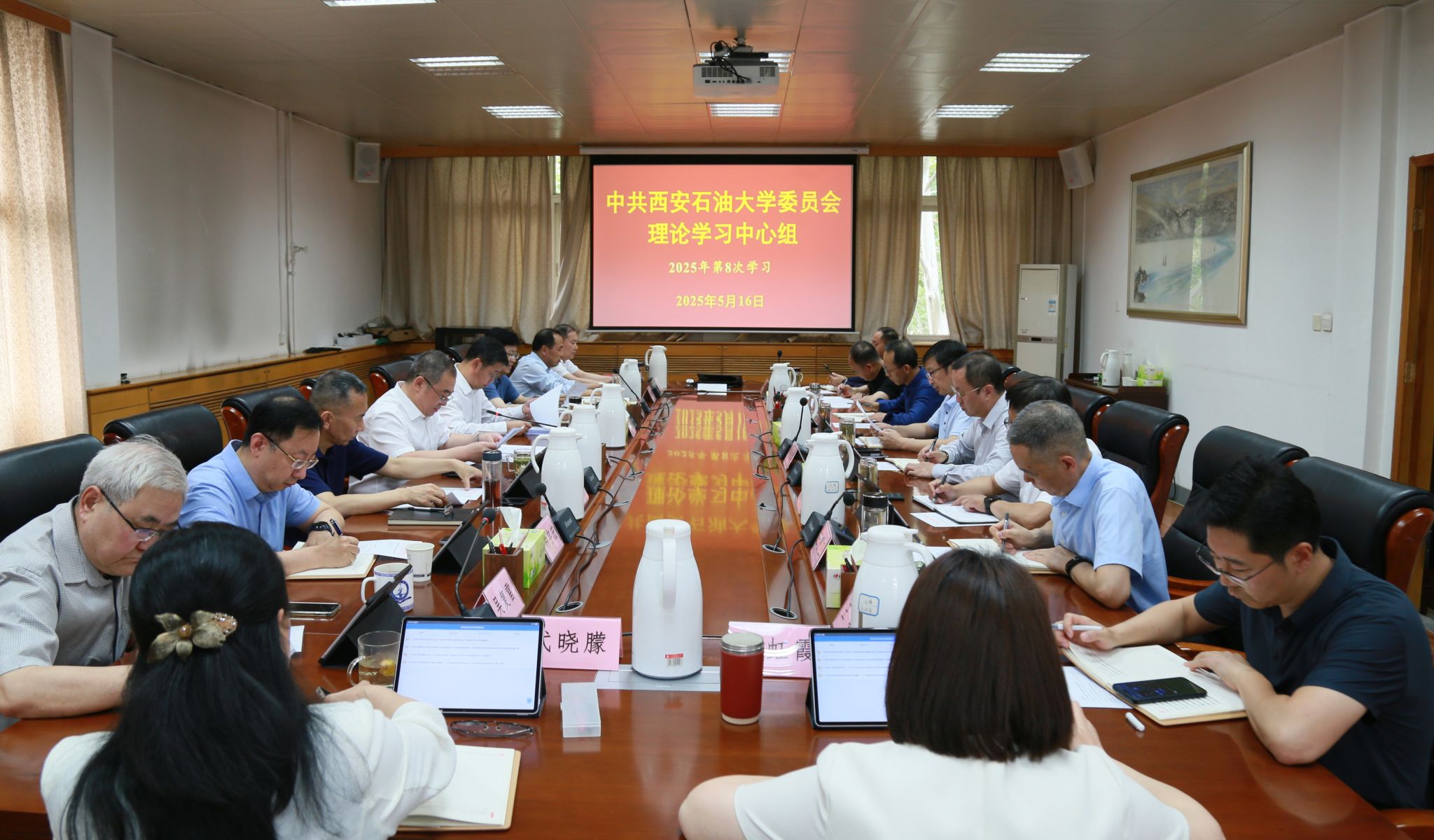 5月16日下午,校党委理论学习中心组2025年第8次学习会在雁塔校区行政楼五楼会议室召开,深入学习习近平总书记在庆祝中华全国总工会成立100周年暨全国劳动模范和先进工作者表彰大会上的重要讲话精神、给谢依特小学戍边支教西部计划志愿者服务队队员重要回信精神和习近平总书记关于做好新时代党的统一战线工作的重要思想。校党委书记常江主持并讲话,校党委理论学习中心组成员参加会议。