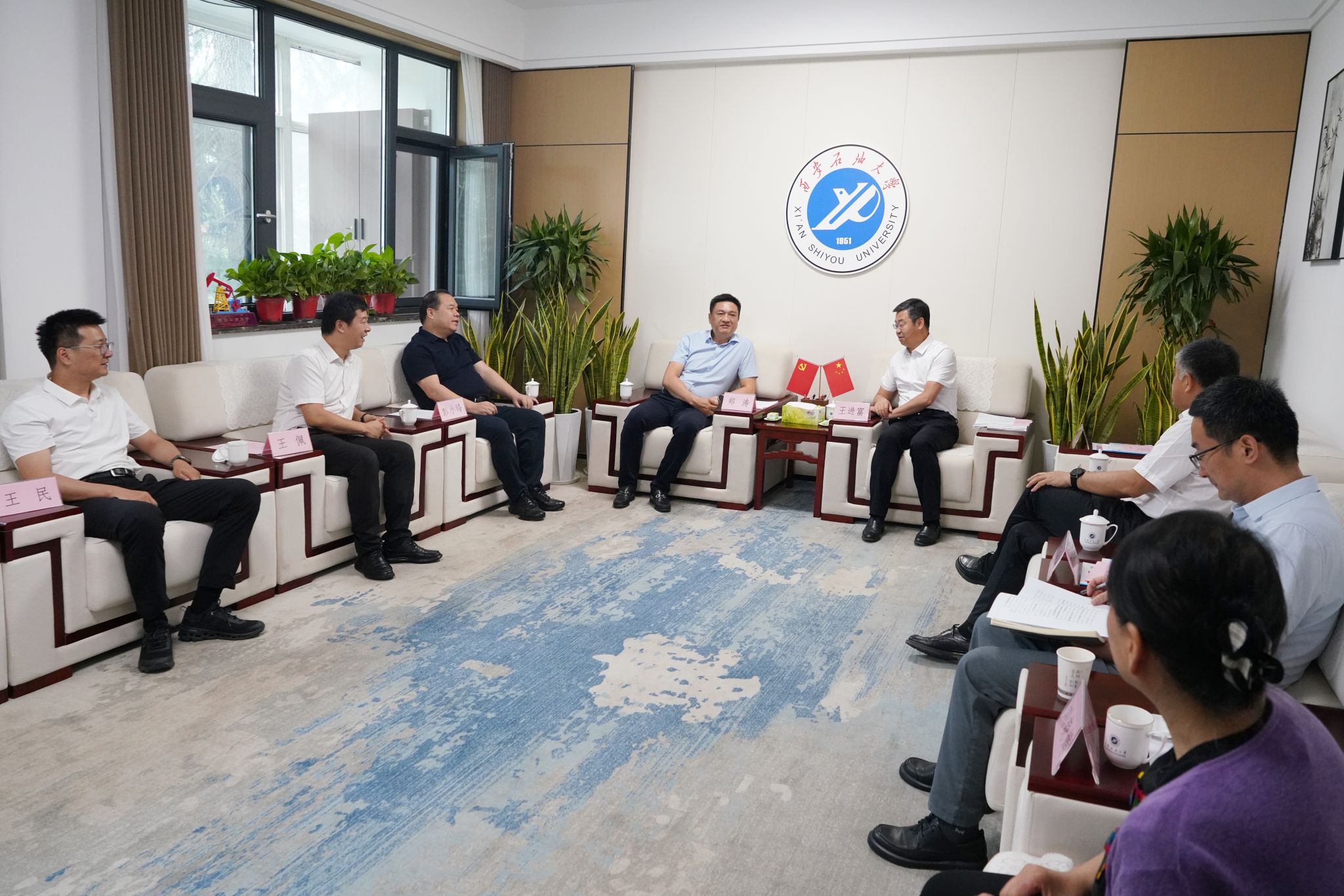 5月26日上午,西咸集团党委委员、副总经理郑涛,西咸能源集团董事长彭小峰,总经理王佩,副总经理王民一行来校洽谈校企合作。beat365官网校长王进富、党委副书记张木在行政楼接待室会见来访客人。