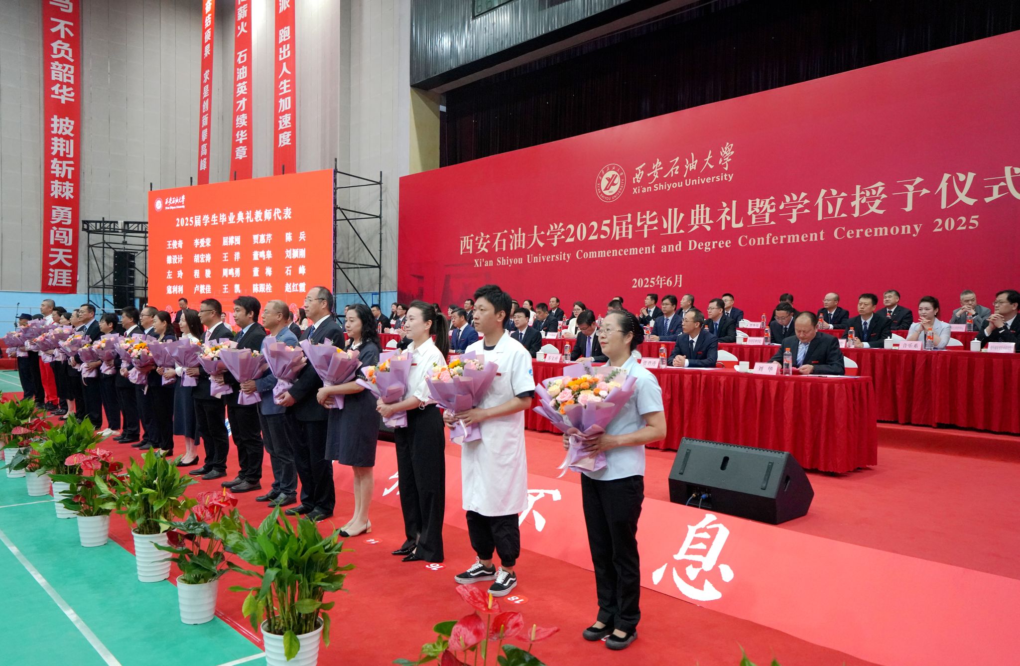 师恩如烛,桃李芬芳。感谢师恩环节,毕业生代表向广大教师、管理干部和服务保障人员代表献花,对他们的辛勤付出和默默奉献表达感恩和敬意,感谢他们以匠心育人才、以初心铸传承、以丹心守薪火。