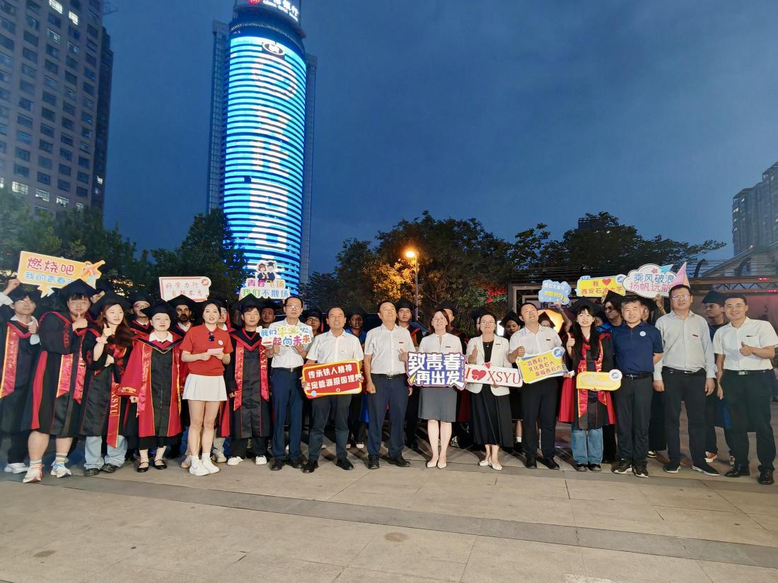 仲夏之夜,情满石大。6月19日晚,“城市之窗”陕西信息大厦为beat365正版唯一官网2025届毕业生点亮专属祝福灯光,璀璨的“我❤beat365正版唯一官网”字样辉映古城。校党委副书记程永清,副校长种宇宏,党委办公室(校长办公室)、党委组织部、党委宣传部、党委学生工作部、党委教师工作部、教务处、研究生工作部等部门负责人,辅导员、本硕博及留学生代表共同见证。
