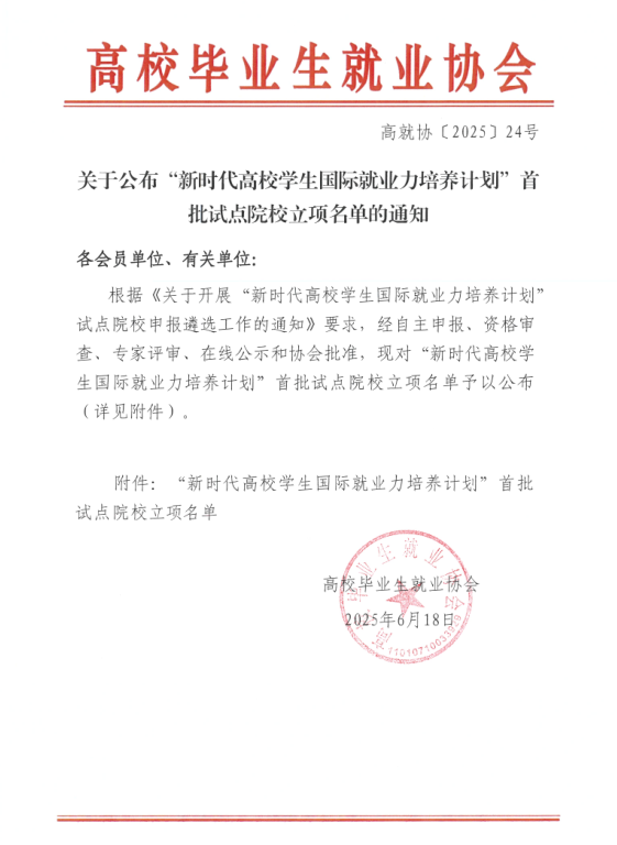 近日,经学校就业创业指导中心申请,高校毕业生就业协会审批,beat365官网成功获批“新时代高校学生国际就业力培养计划”试点单位,成为全国首批立项的56个院校之一,标志着学校在国际化人才培养领域迈出重要一步,对提升beat365官网毕业生赴国(境)外就业,提升国际竞争力,促进毕业生高质量充分就业具有重要意义。