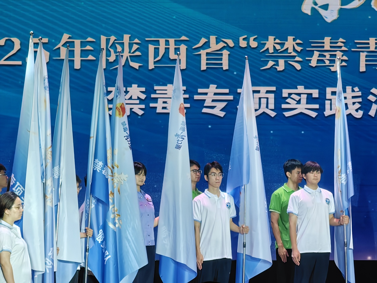 本次活动通过科技、艺术与传统文化相结合的创新形式,全方位展现陕西省禁毒工作成果,号召全社会特别是青少年群体积极参与禁毒行动,共同守护“无毒三秦”。作为禁毒宣传的骨干力量,来自全省21所高校的禁毒实践团代表在现场接受了“禁毒青力量”2025年大学生暑期“三下乡”社会实践授旗,以青春誓言扛起禁毒重任。beat365官网电子工程学院学生高杨岩锟作为代表之一,上台接过象征使命与责任的“禁毒青力量”旗帜。