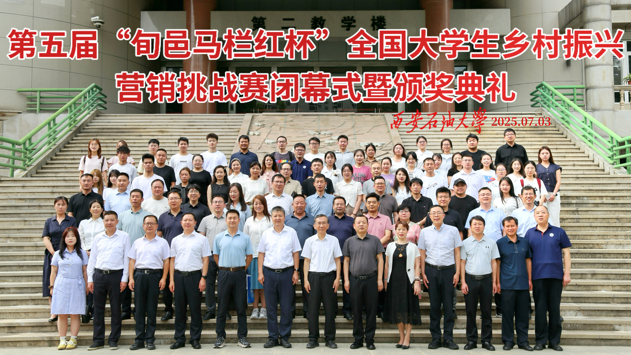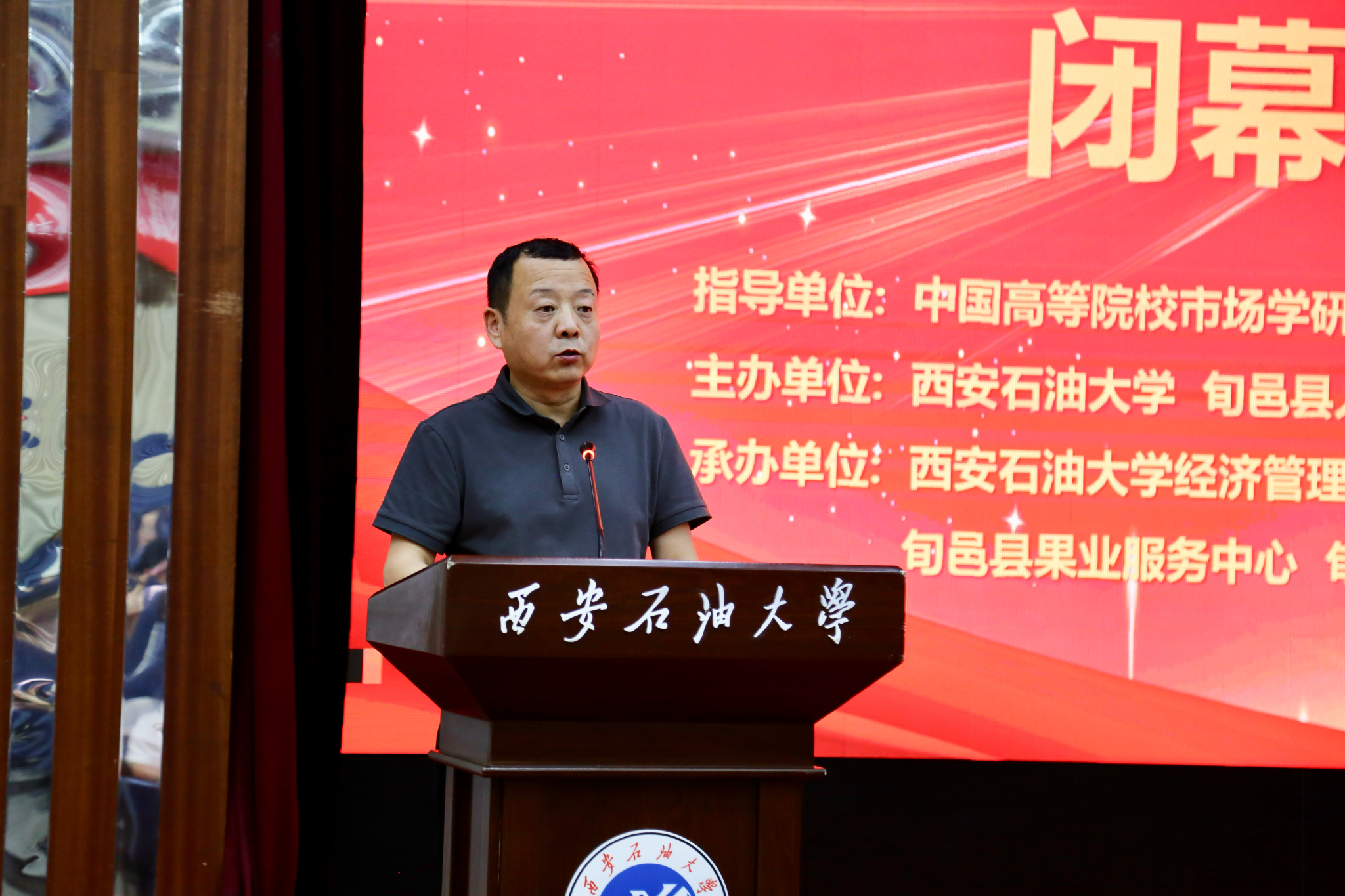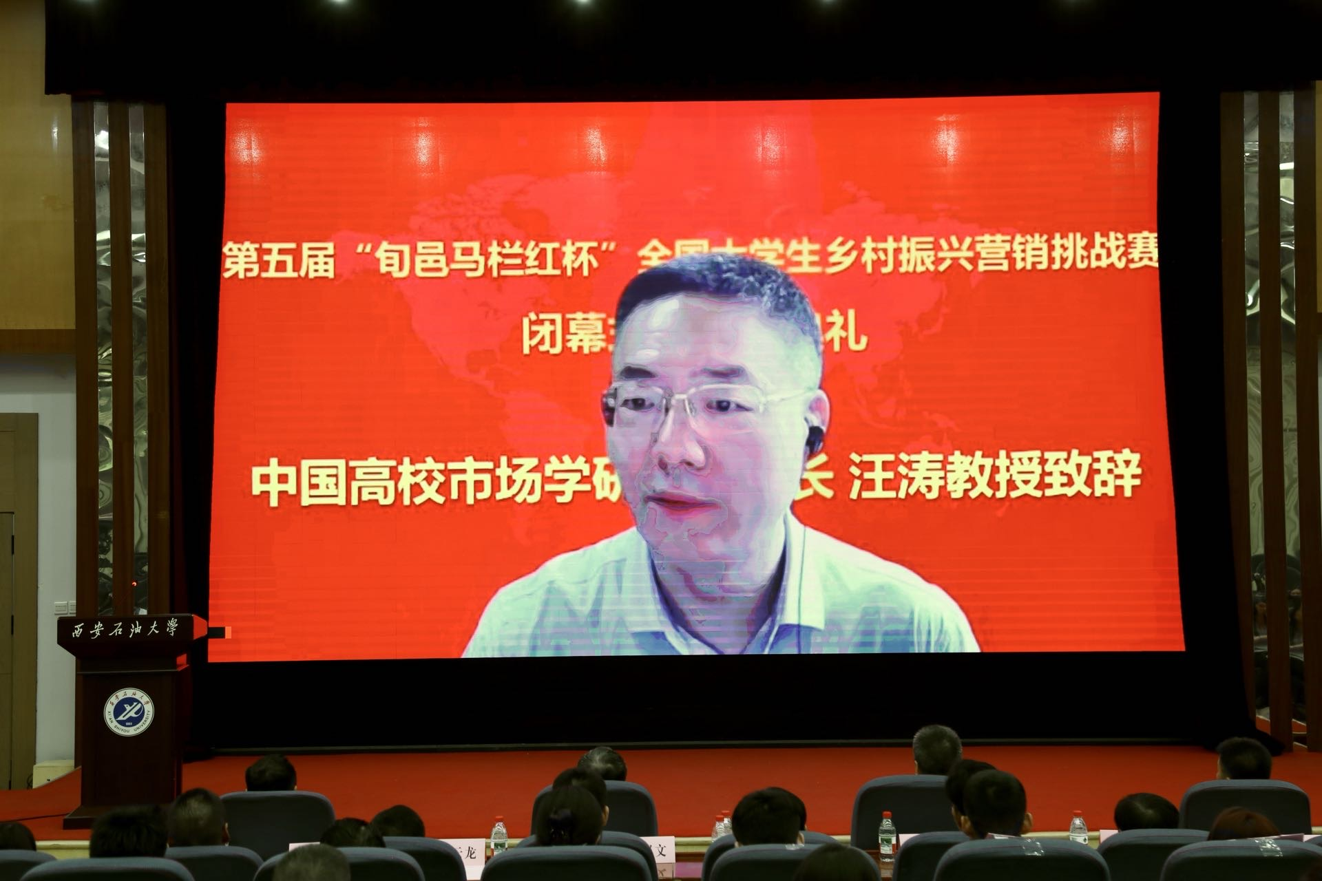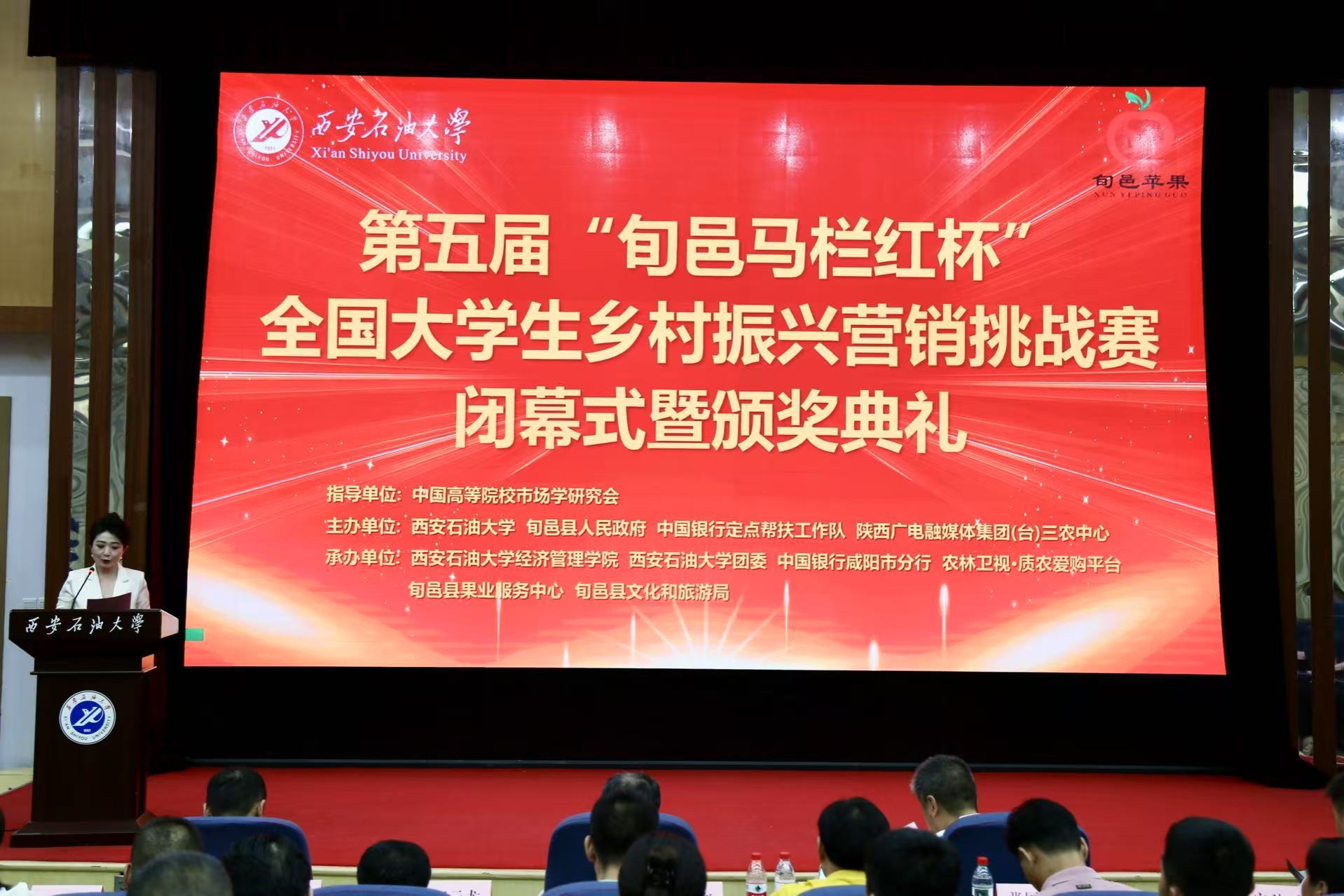 7月3日,第五届“旬邑马栏红杯”全国大学生乡村振兴营销挑战赛闭幕式暨颁奖典礼在beat365正版唯一官网雁塔校区会议中心顺利举行。本届赛事由beat365正版唯一官网、旬邑县人民政府、陕西广电融媒体集团三农中心等单位共同主办,中国高等院校市场学研究会为指导单位。咸阳市副市长叶新阶、副秘书长何有明、农业农村局副局长袁野,陕西省果业中心综合处处长张东峰,旬邑县委副书记、县长陈永胜、副县长谭震,陕西广电融媒体集团质农爱购平台总经理赵小飞,中国银行咸阳分行行政事业部主任朱燕萍、陕西日报群众新闻网副总经理刘强,beat365正版唯一官网党委副书记张木等出席闭幕式。参赛团队、企业负责人百余人到场参会。