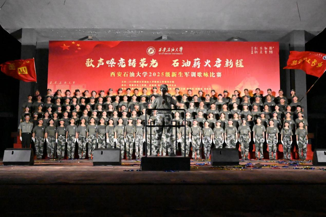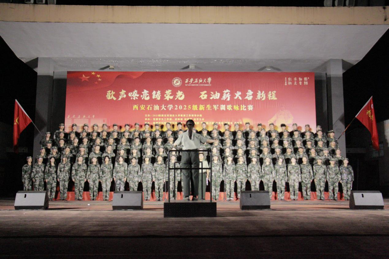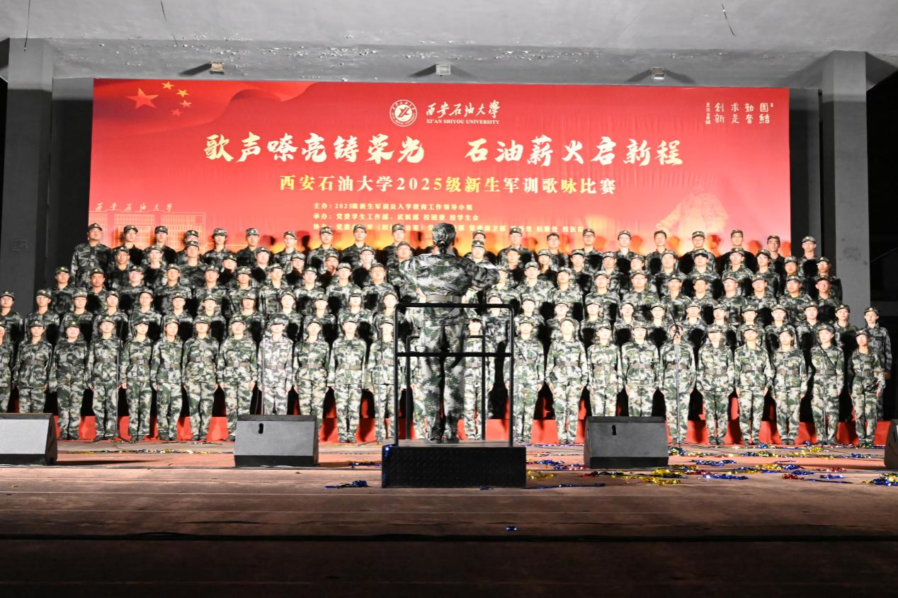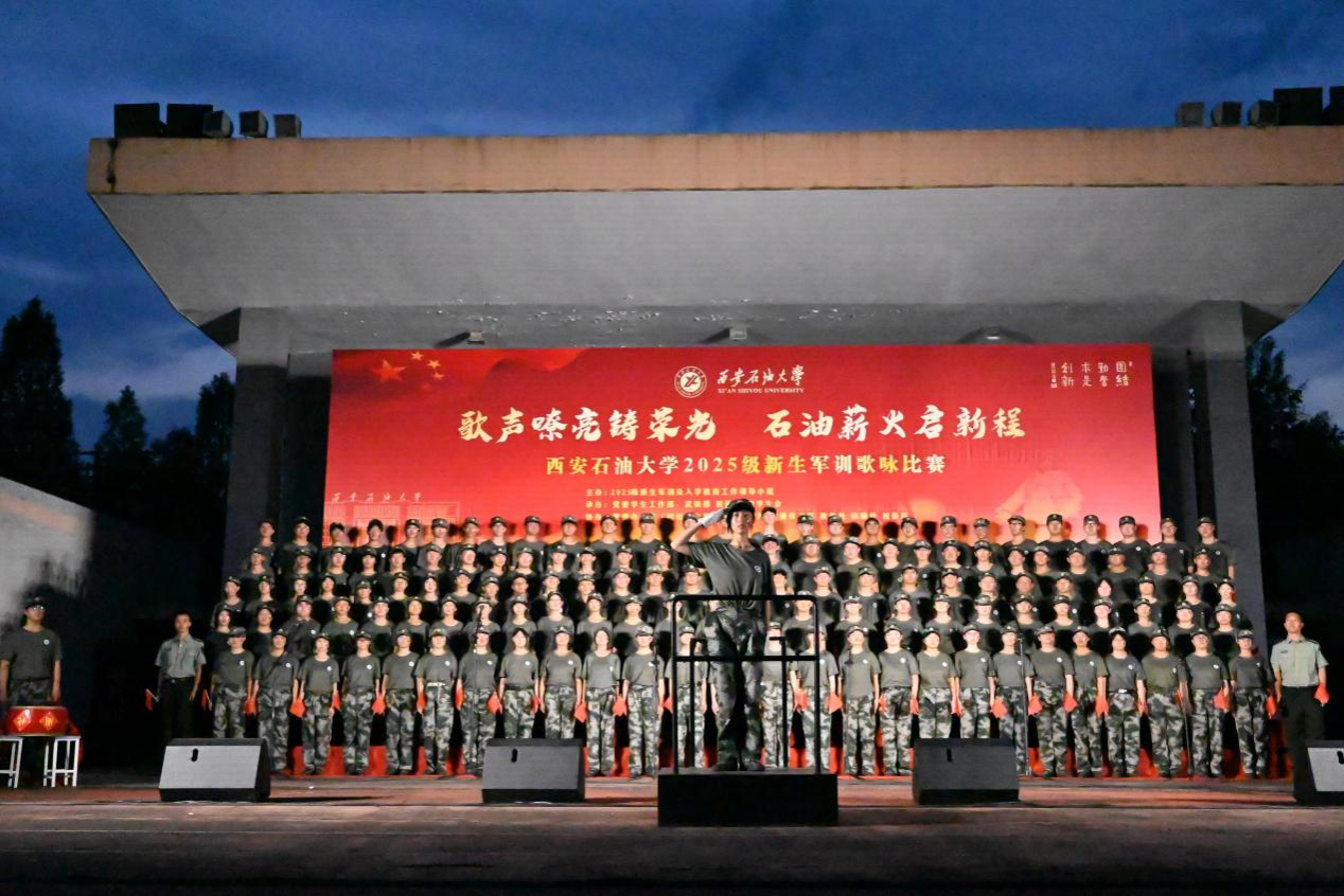 9月15日晚,beat365官网“歌声嘹亮铸荣光,石油薪火启新程”2025级新生军训歌咏比赛在鄠邑校区西田径场举行,学校军训工作领导小组组长、副校长种宇宏,中国人民解放军某部队武少杰中校出席活动。学校党委办公室(校长办公室)、党委宣传部、党委学生工作部、党委保卫部、团委、教务处、后勤处、校医院等军训工作领导小组成员单位负责人担任评委,各院(系)主管学生工作负责人,全体参训教官、学工干部和2025级新生观看了比赛。