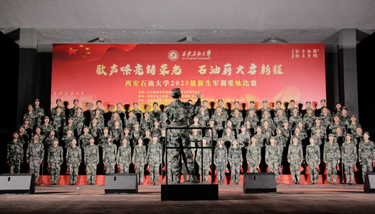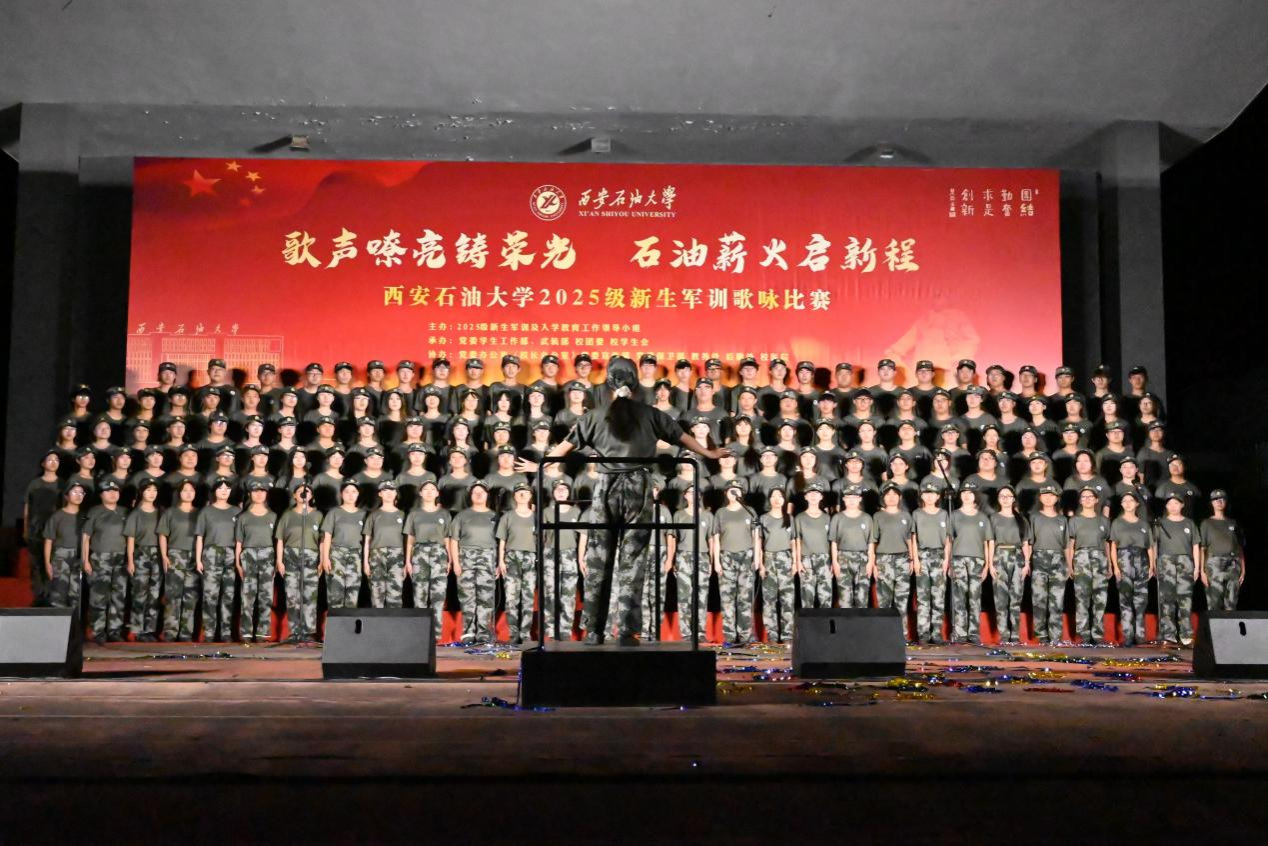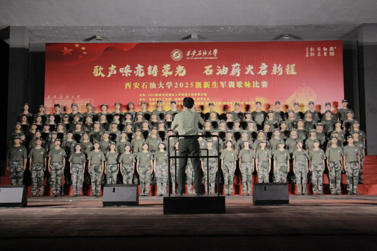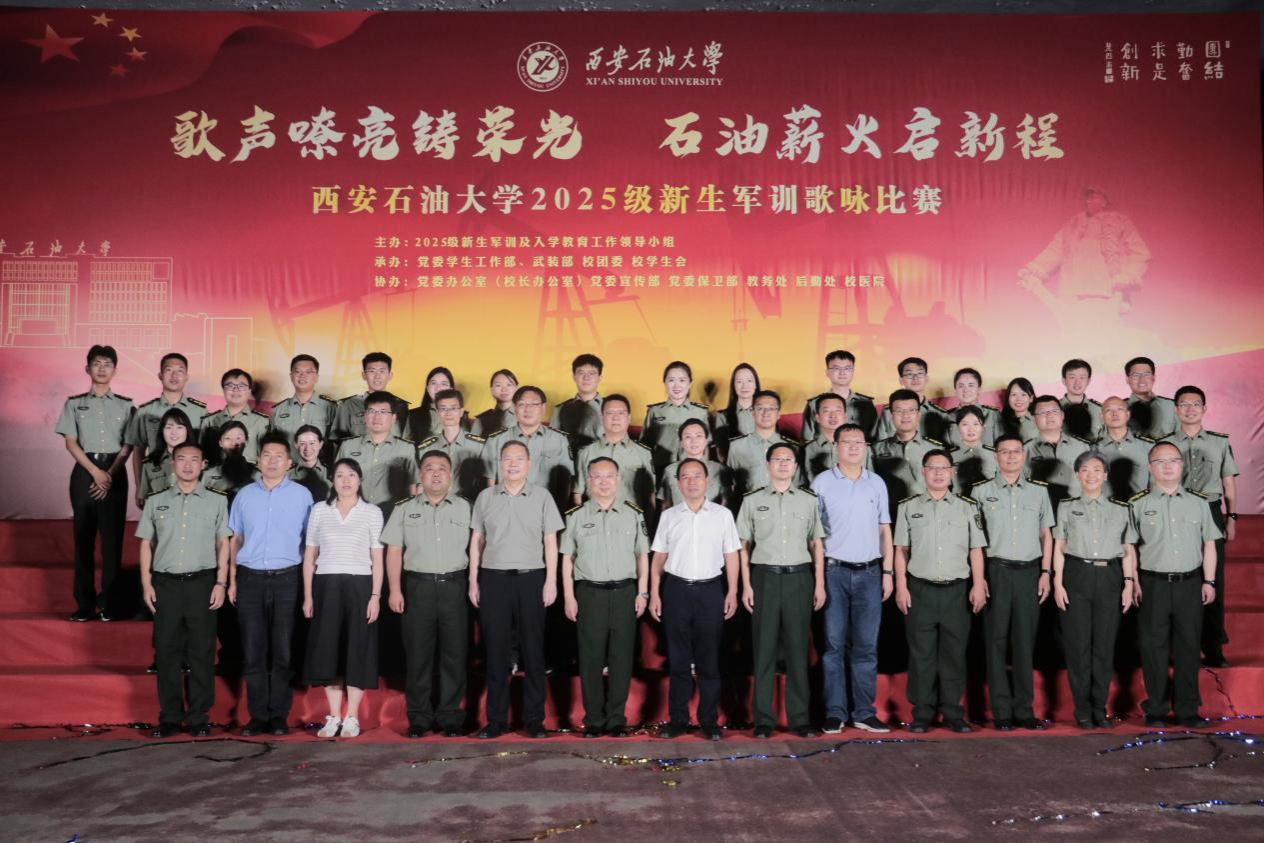 9月15日晚,beat365官网“歌声嘹亮铸荣光,石油薪火启新程”2025级新生军训歌咏比赛在鄠邑校区西田径场举行,学校军训工作领导小组组长、副校长种宇宏,中国人民解放军某部队武少杰中校出席活动。学校党委办公室(校长办公室)、党委宣传部、党委学生工作部、党委保卫部、团委、教务处、后勤处、校医院等军训工作领导小组成员单位负责人担任评委,各院(系)主管学生工作负责人,全体参训教官、学工干部和2025级新生观看了比赛。