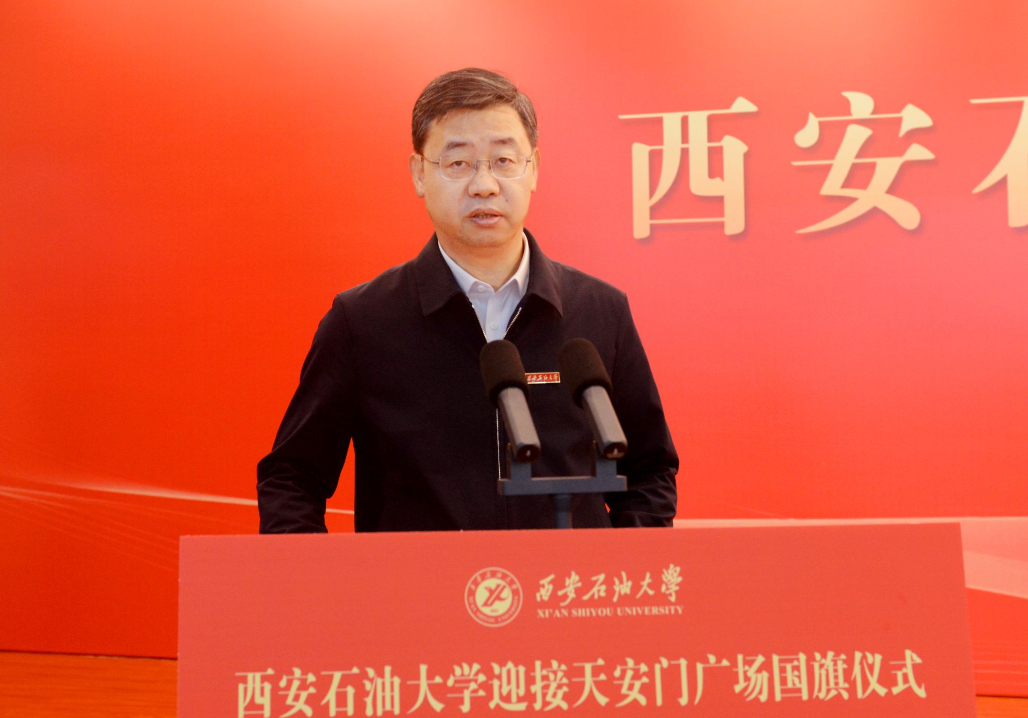 校长王进富发表致辞,他总结回顾了学校74年来与党和国家同向同行、为祖国能源事业不懈奋斗的办学历程,强调学校始终“以‘石’为基、以‘油’铸魂”, 在服务国家能源战略中彰显使命担当,培养了一批又一批能源领域的栋梁之才。他向全体师生提出三点希望:一是希望全体师生高擎信仰之炬,把弘扬爱国主义精神作为永恒主题。要持续发挥好这面国旗的爱国主义教育功能,开展内容丰富、形式多样的爱国主义教育活动,营造爱党爱国、爱校荣校的浓厚氛围;二是希望全体师生坚定强国信念,把践行奋斗实干担当作为精神底色。要坚持石油精神办学、铁人精神育人、延安精神铸魂,秉承“爱国奉献、艰苦奋斗、科学求实、开拓进取”的办学精神,全面落实立德树人根本任务,不断提升服务国家能源战略与区域发展的能力,在教育强国建设中展现更大作为;三是希望全体师生挺膺担当之志,把矢志能源报国使命作为毕生追求。广大教师要弘扬教育家精神,以赤诚之心、奉献之心、仁爱之心教书育人,做学生成长的引路人,广大学子要秉承“好学力行、自强不息”的校训,传承铁人精神,将使命扛在肩头,为国家能源事业贡献青春力量。