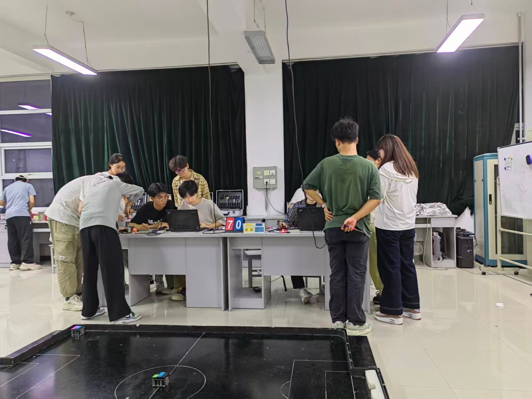 冠军的奖杯,由机器人团队师生无数个日夜的奋斗与汗水铸就。为了备战此次大赛,自今年年初便开始了校赛培训、选拔和有计划的集训。FIRA小型组的机器人需要极高的敏捷性和复杂的多机协作算法,代码组队员们为了一个战术动作,为了几毫秒的速度提升,不断进行算法优化和调试。在高强度的比赛和训练中,机器人面临着持续的磨损与意外损伤,维护小组同学具备“外科医生”般的精准与耐心,守护着机器人的“身体健康”,每日赛前进行全面的硬件检测,赛后则立即进行保养检修。从电机扭矩的细微校正、电池电量测定、小车胎皮检测、传感器灵敏度的反复标定,从线路连接的紧固到齿轮传动的润滑,确保了每一台机器人都能以最佳状态投入每一场比赛。正是有了平时的训练有素,才有了赛场上的从容淡定。