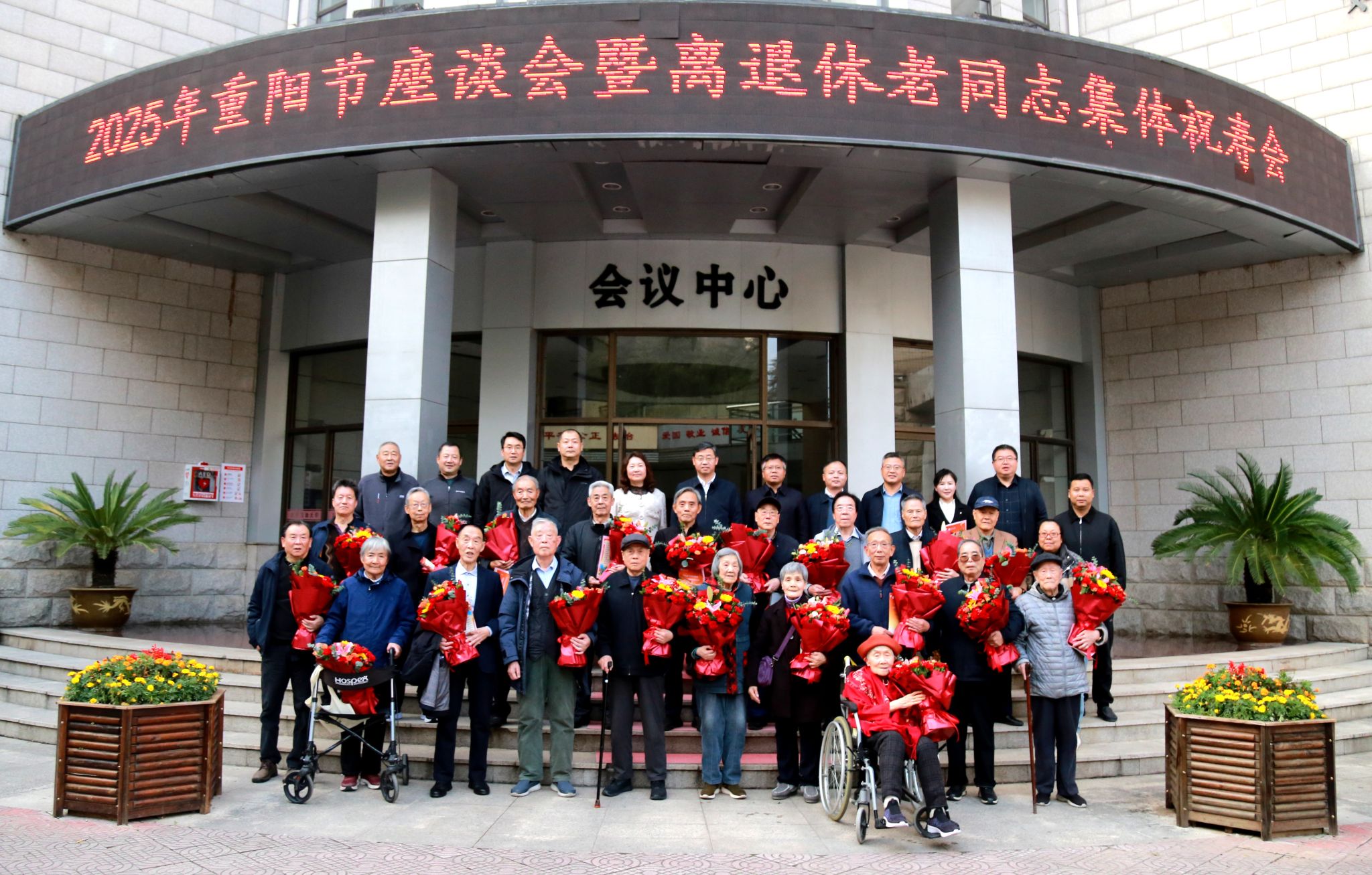会后,学校领导与老寿星代表合影留念。组织部、人事处、教务处、后勤处、离退休工作处、校医院等单位负责人参加会议。