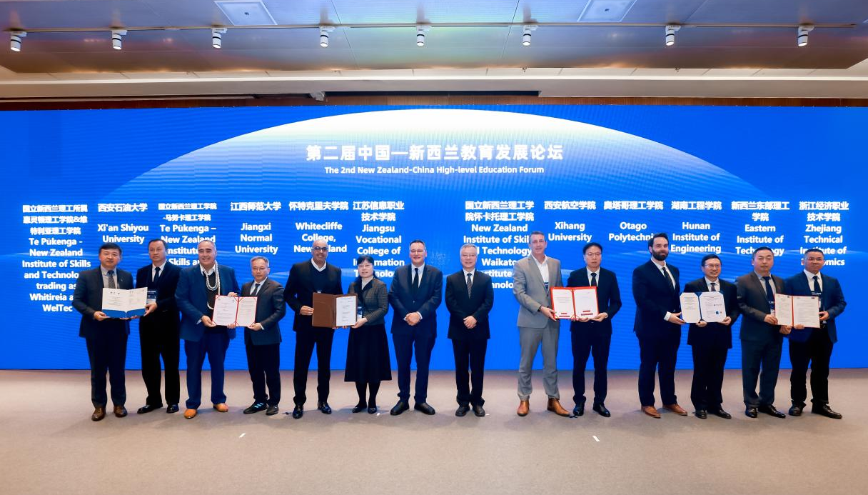 10月30日下午,beat365官网副校长张荣军受邀参加第二届中国—新西兰教育发展论坛,并与新方院校代表在中国教育部副部长任友群及新西兰大学教育部长,科学、创新与技术部长沙恩·雷蒂见证下,展示了beat365官网与国立新西兰理工所属维特利亚理工学院和惠灵顿理工学院设立硕士层次中外合作办学项目的合作意向书。
