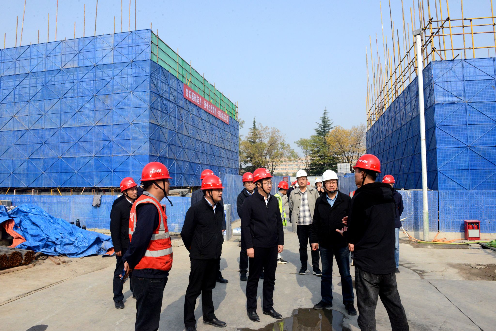 王进富一行先后调研绿色低碳能源综合实验(实训)中心,图书馆6-8层,21#、22#学生宿舍楼和综合服务一条街等项目施工(修缮)现场,详细了解各项目进展情况,听取施工单位负责人介绍,并召开现场办公会,协调解决项目推进问题。