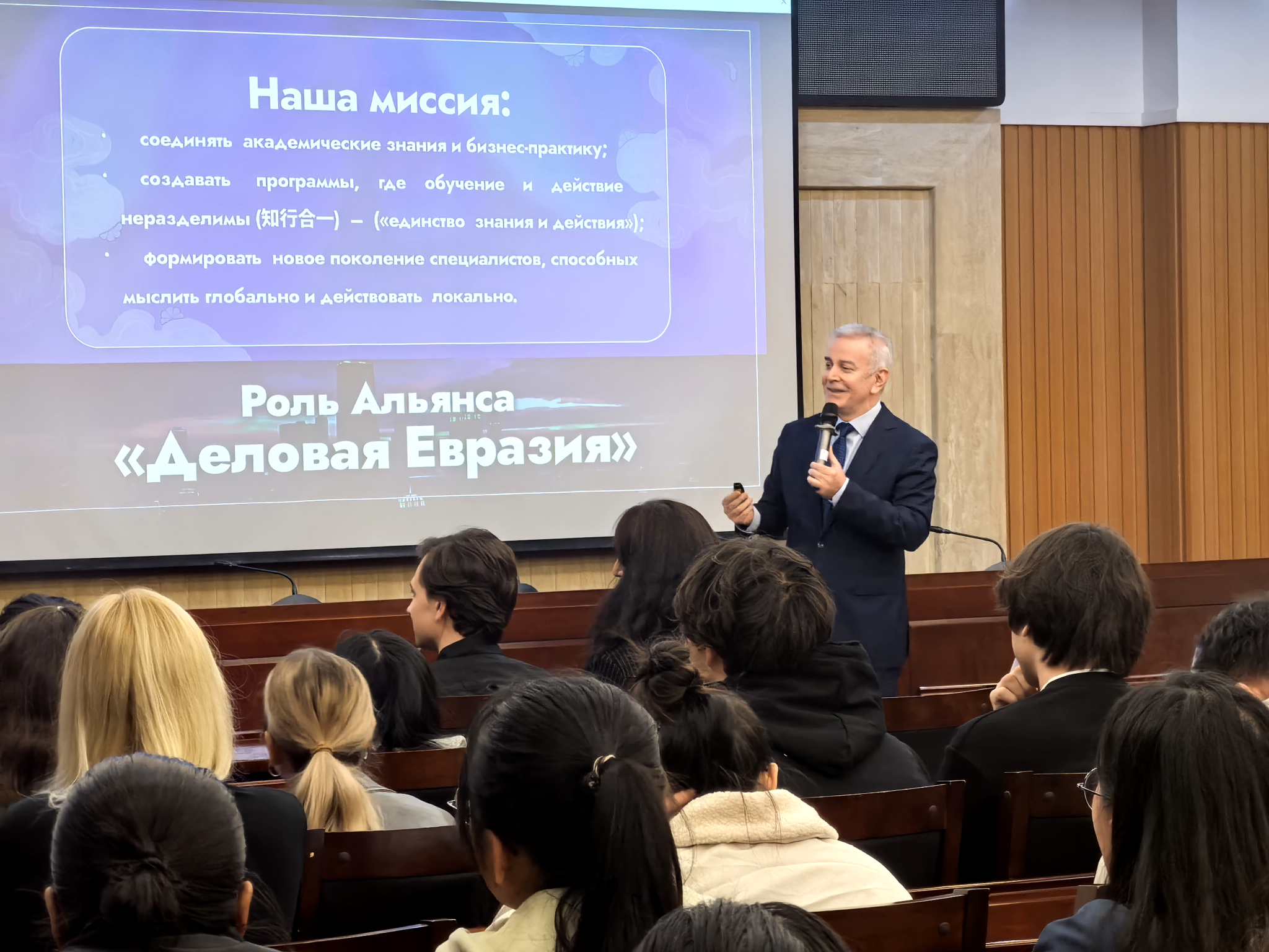 伊姆兰·阿克佩罗夫在题为《欧亚地区商业教育转型研究》的学术报告中,提出当代教育的三类重要挑战,即理论与实践的脱节、数字化转型和跨文化合作,进而介绍融合学术知识与商业实践的“欧亚专家”一体化教育新模式。他认为中国在未来世界发展格局中具有重要影响,鼓励师生知行合一,持续提升国际视野和创业思维。