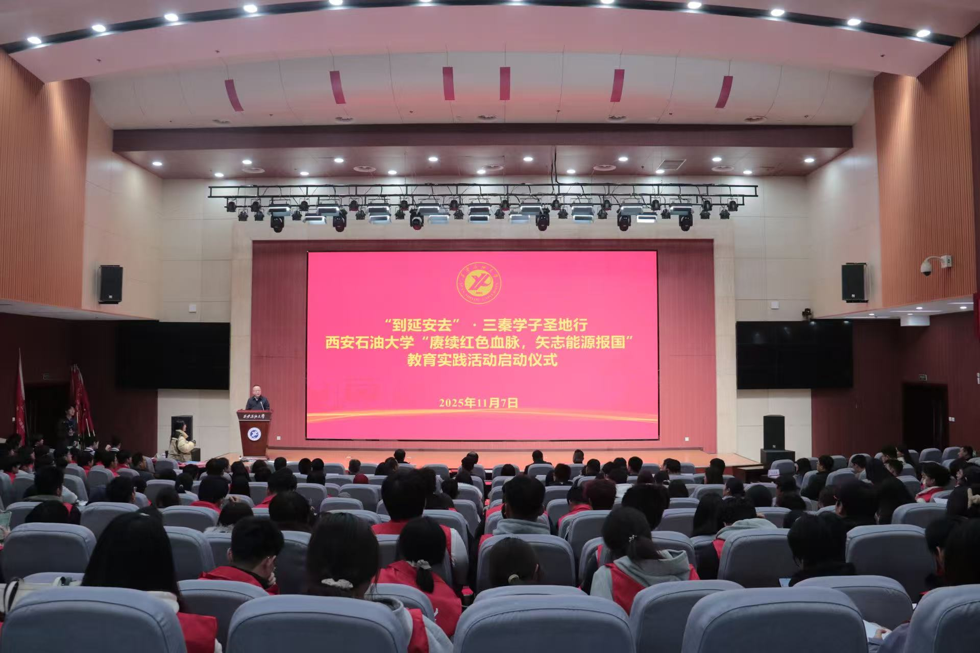 为深入贯彻习近平总书记关于“延安精神是党的宝贵精神财富,要代代传承下去”的重要指示精神,用好延安革命圣地丰富的红色资源,充分发挥育人作用,根据陕西省委教育工委《关于组织开展“到延安去”·三秦学子圣地行活动的通知》要求,推动红色文化资源深度融入“大思政课”建设和立德树人全过程,11月7日下午,学校在鄠邑校区弘石学术报告厅举行“到延安去”・三秦学子圣地行—beat365正版唯一官网“赓续红色血脉,矢志能源报国”教育实践活动启动仪式。副校长种宇宏出席仪式并讲话,党委组织部、党委学生工作部、校团委、马克思主义学院、继续教育学院等单位负责人,各院(系)学生工作负责人,团委(团总支)书记,学生党支部书记及预备党员代表,第十八期校级青年马克思主义者干部培训班优秀学员代表,团学骨干代表,2025级班级团支部书记代表400余人参加仪式。