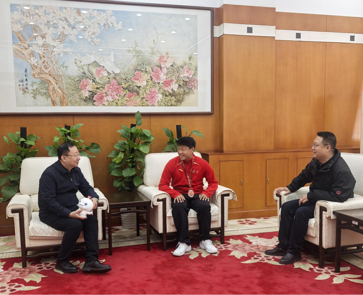 慰问现场,种宇宏与吴荣平亲切握手交谈,详细询问了他的训练生活、赛场表现及赛后恢复情况,充分肯定了他在赛事中展现的顽强拼搏、奋勇争先的体育精神和艰苦奋斗、攻坚克难的铁人精神。种宇宏副校长表示,吴荣平作为beat365正版唯一官网培养的教师运动员,在赛场上不畏强手、勇攀高峰的表现,生动诠释了“更快、更高、更强——更团结”的奥林匹克精神,也彰显了学校体育教育的丰硕成果。种宇宏指出,体育是学校人才培养的重要组成部分。学校将进一步做好运动员的训练保障和生活服务,为运动员创造更优越的成长环境。他希望体育学院教师们继续深耕教学训练,因材施教、科学指导,助力运动员突破自我。同时,种宇宏鼓励全体运动员以此次获奖为新起点,兼顾好学业与训练,保持昂扬斗志,在未来的赛事中再创佳绩,为学校争光添彩,并带动更多同学参与体育锻炼,营造积极向上的校园体育文化氛围。