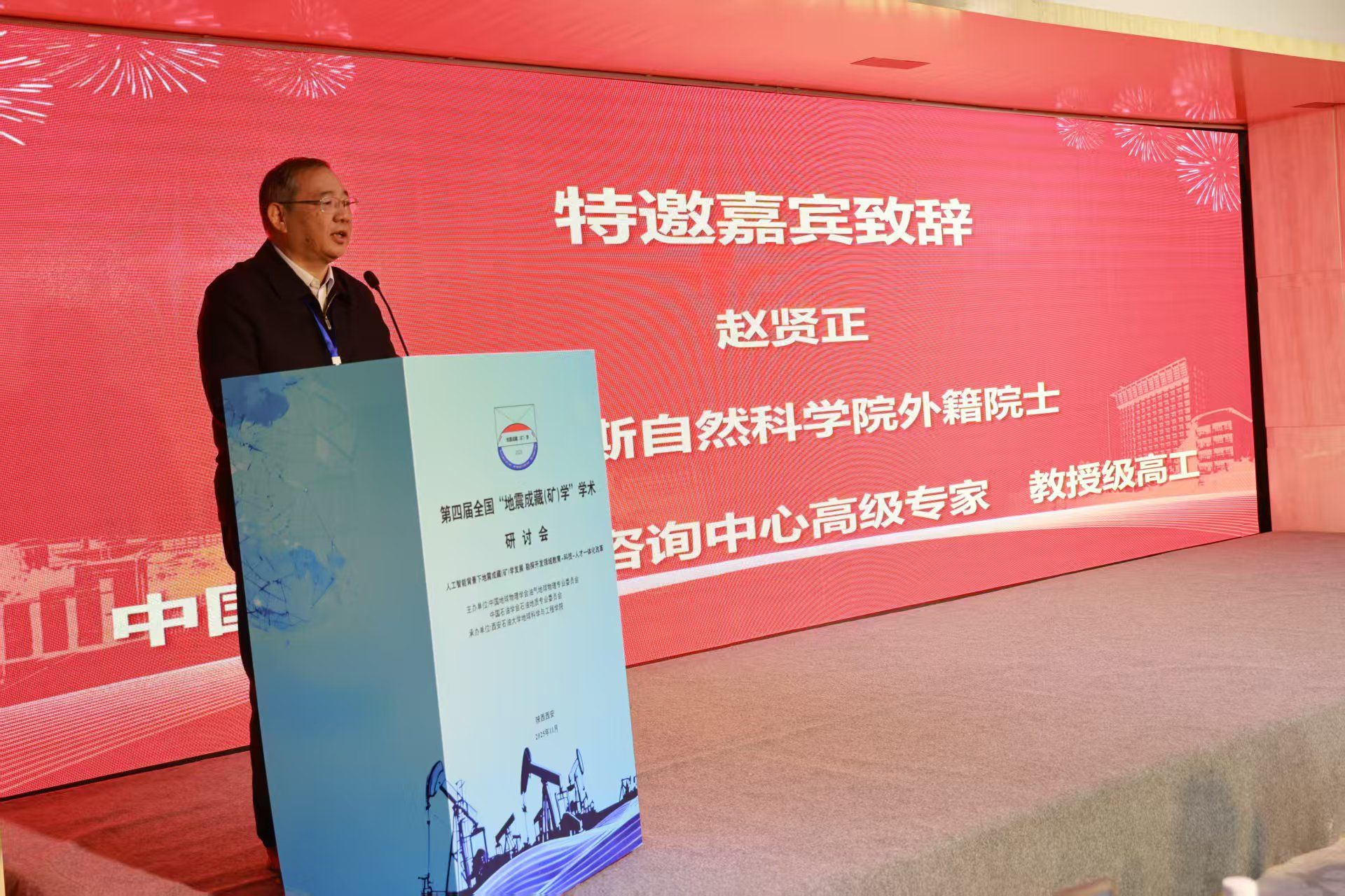 特邀嘉宾俄罗斯自然科学院外籍院士、中国石油集团咨询中心高级专家赵贤正教授代表会议主办单位致辞。赵贤正表示,地震成藏(矿)学自2009年提出以来,已在理论与技术上取得显著进展,成为指导复杂地质条件下油气勘探的重要支撑,并呼吁广大科技工作者加强学科交叉与产学研合作,推动该学科向纵深发展,为我国能源勘探开发提供更强有力的理论和技术保障。