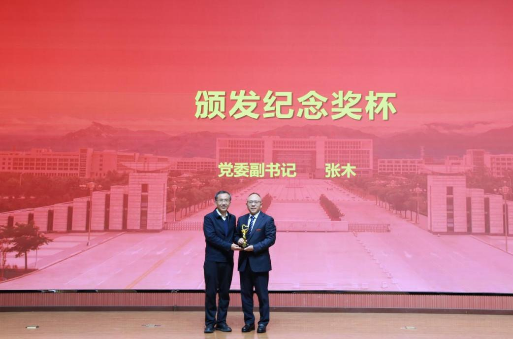 张木满怀深情地宣读《腾辉助学金廿周年庆典纪念册》亲笔序言,追忆1988年与何荣校友相识的点滴,激动与感恩之情溢于言表,他深情地赞叹何荣校友求学时的奋进拼搏,与事业维艰之时仍坚持回馈母校的赤子情怀。随后,张木为何荣校友颁发“廿年初心・资助育人功勋奖”纪念奖杯,那沉甸甸的奖杯满载着全校师生对他二十年坚守育人初心的崇高敬意,现场掌声经久不息。
