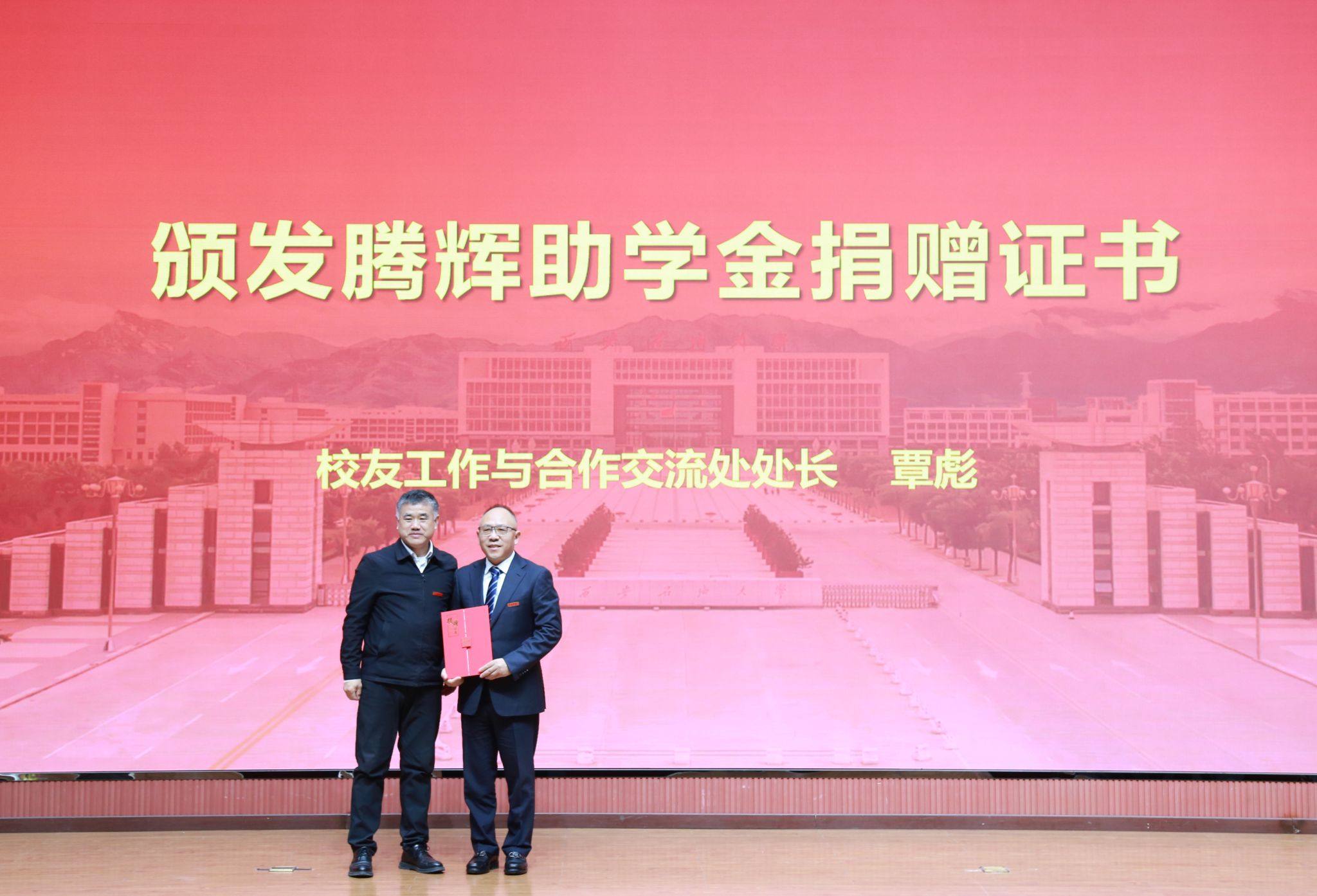 在腾辉助学金发放仪式上,学生工作处处长王亮宣读了2025年受助学生名单,何荣为受助学生代表颁发证书,并赠书——《富有的习惯》。校友工作与合作交流处处长覃彪为何荣颁发捐赠证书,这份证书不仅是对他的高度认可,更是对这份二十年如一日爱心坚守的致敬。