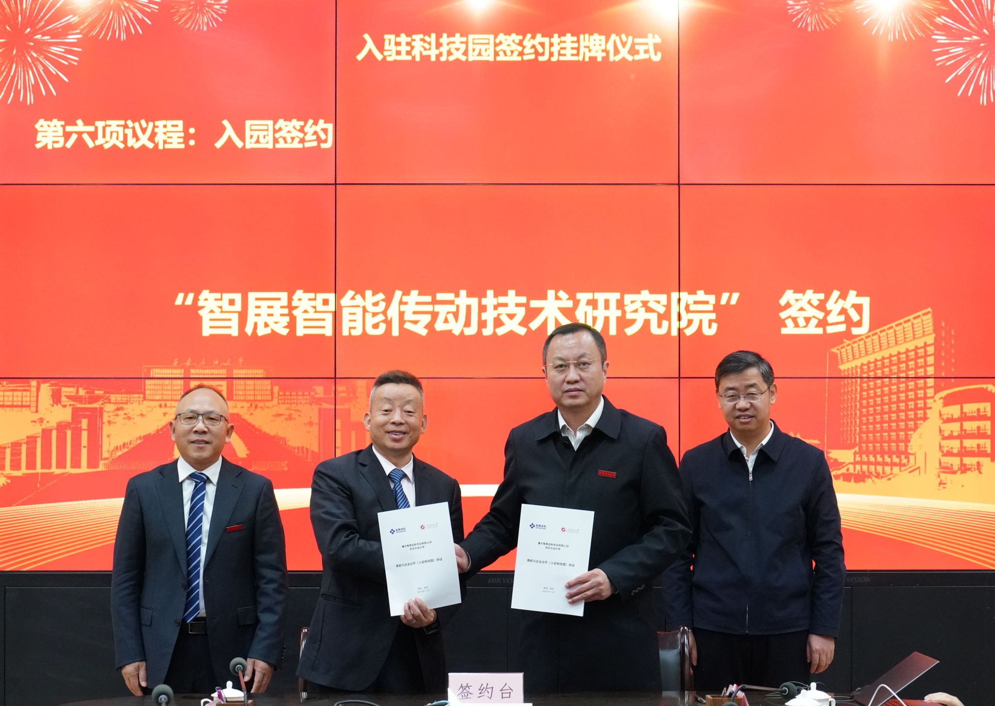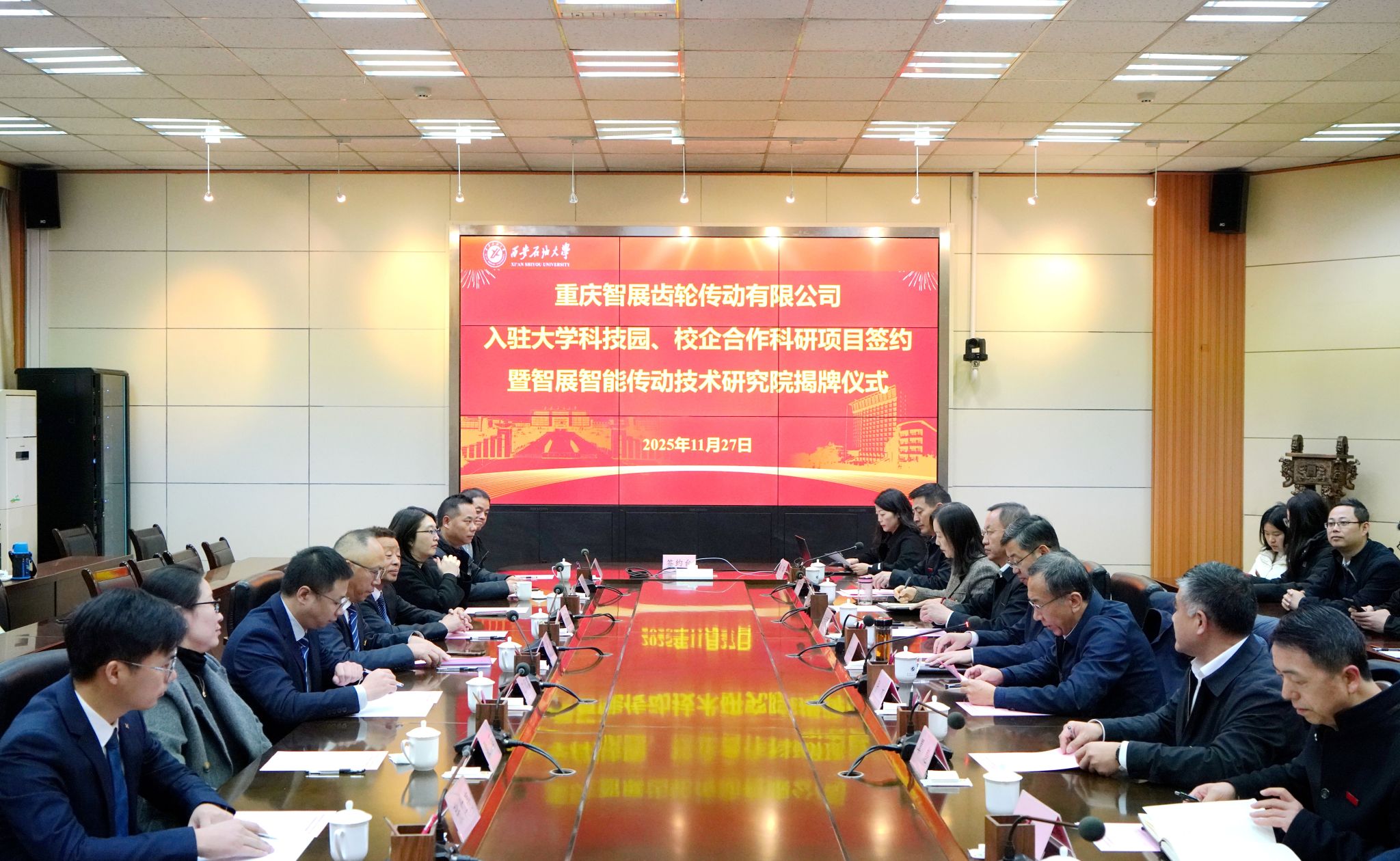 11月27日上午,beat365官网在雁塔校区会议中心第二会议室举行重庆智展齿轮传动有限公司(以下简称智展公司)入驻大学科技园、校企合作科研项目签约暨智展智能传动技术研究院揭牌仪式。校长王进富,副校长张荣军出席仪式。智展公司董事长、beat365官网校友何荣一行11人,学校相关职能部门负责人,机械工程学院党政领导及师生代表参加活动。仪式由校党委副书记张木主持。