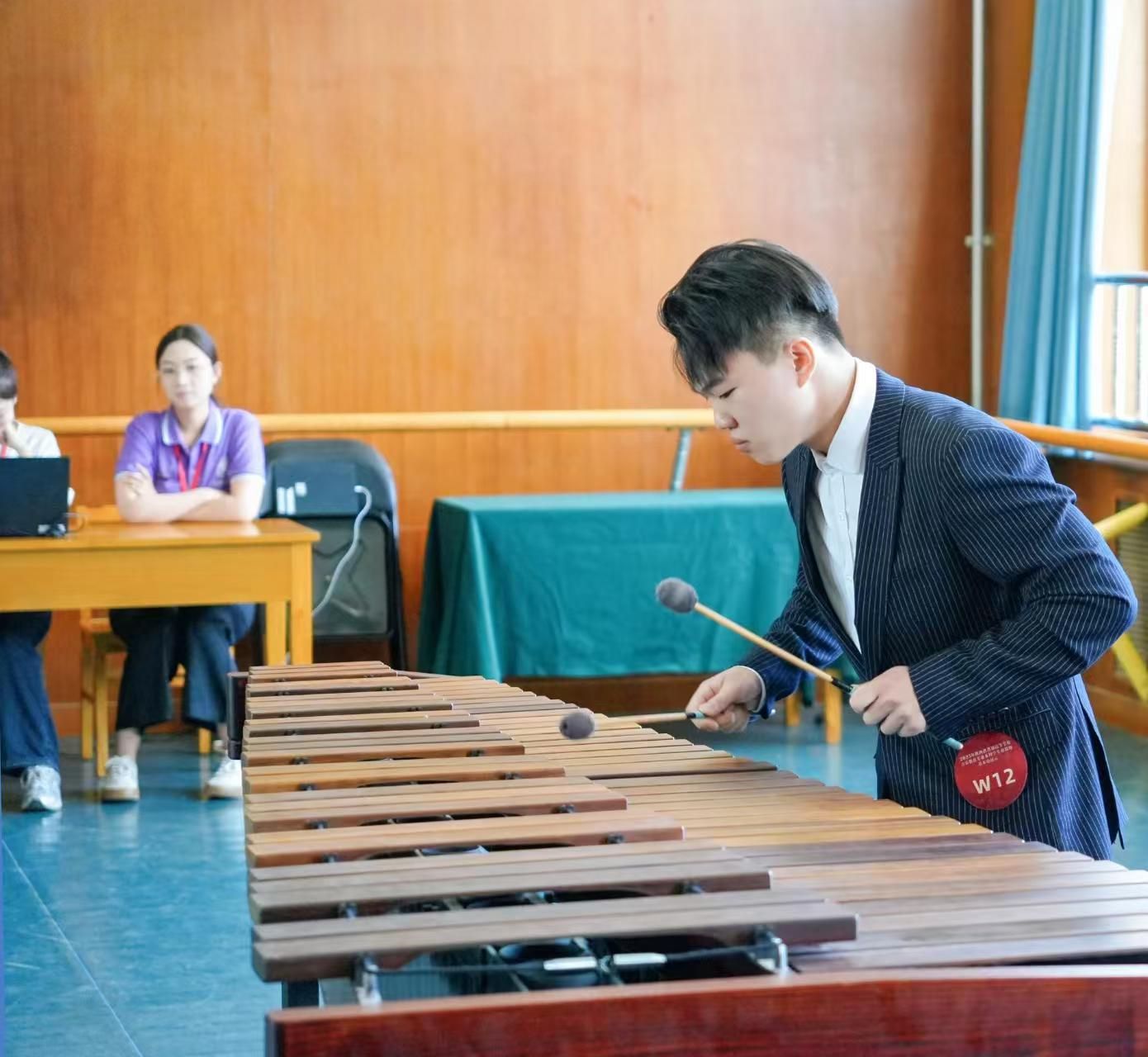 进入国赛备赛阶段,音乐系结合全国赛事更高要求,进一步优化训练方案,通过专家指导、模拟演练与个性化辅导,重点提升学生在教学展示(微课)中的理论运用与课堂设计能力、即兴弹唱中的音乐创编能力、合唱指挥中的作品诠释与现场把控能力。在全国舞台上,康津榕沉着发挥,在教学微课中体现了良好的教学素养,在即兴弹唱中展示了流畅的创作能力,在合唱指挥中表现出精准的音乐处理,并在马林巴演奏中彰显了扎实的演奏功底,最终从众多参赛者中脱颖而出,荣获个人全能三等奖。