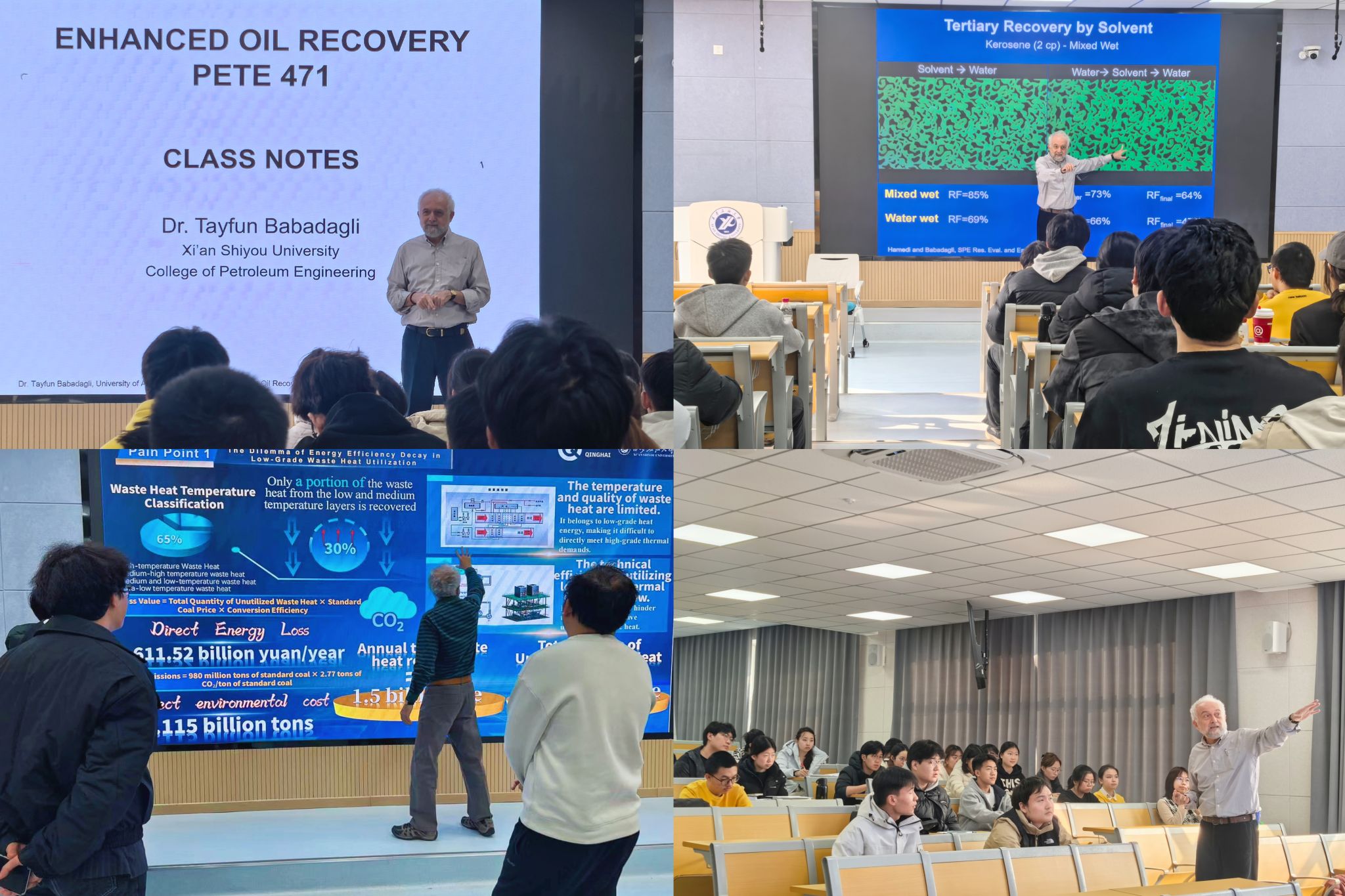 作为全球非常规油气开发与地热能利用领域的权威专家,Tayfun教授以深厚的学术积淀和丰富的工程实践经验,围绕“现代油气藏工程前沿技术”“人工智能在油藏模拟中的应用”“低碳能源转型下的石油工程新范式”等前沿主题展开系统讲授。他以全球视野为纲,以工程实际为锚,将前沿学术动态、先进工程理念与具体案例深度融合。其授课内容兼具广度与深度,始终以深入浅出、生动明晰的方式呈现,极大地激发了学生们的求知热情与探索欲。