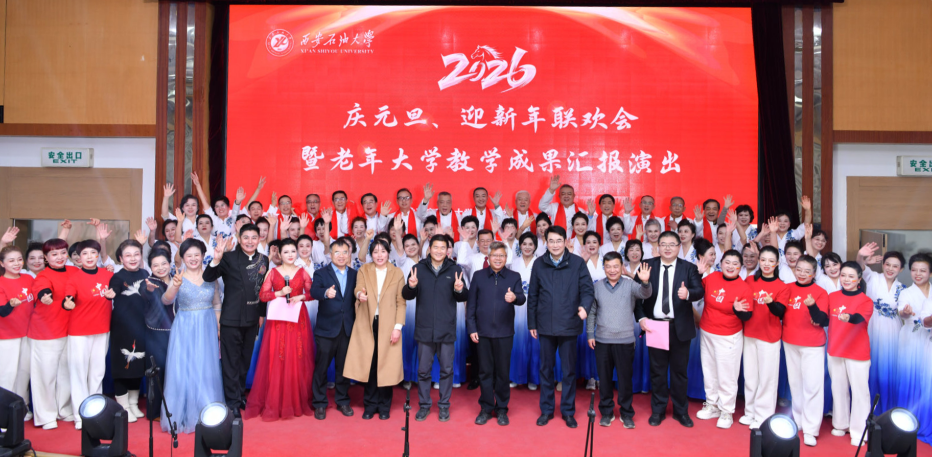 12月29日下午,“庆2026年元旦、迎新年联欢会“暨老年大学教学成果汇报演出在雁塔校区会议中心学术报告厅举行。副校长张骁勇出席联欢会并致辞,工会、后勤处、期刊中心、校医院、离退休工作处负责人与全校300余名离退休职工欢聚一堂,喜迎2026年元旦的到来。