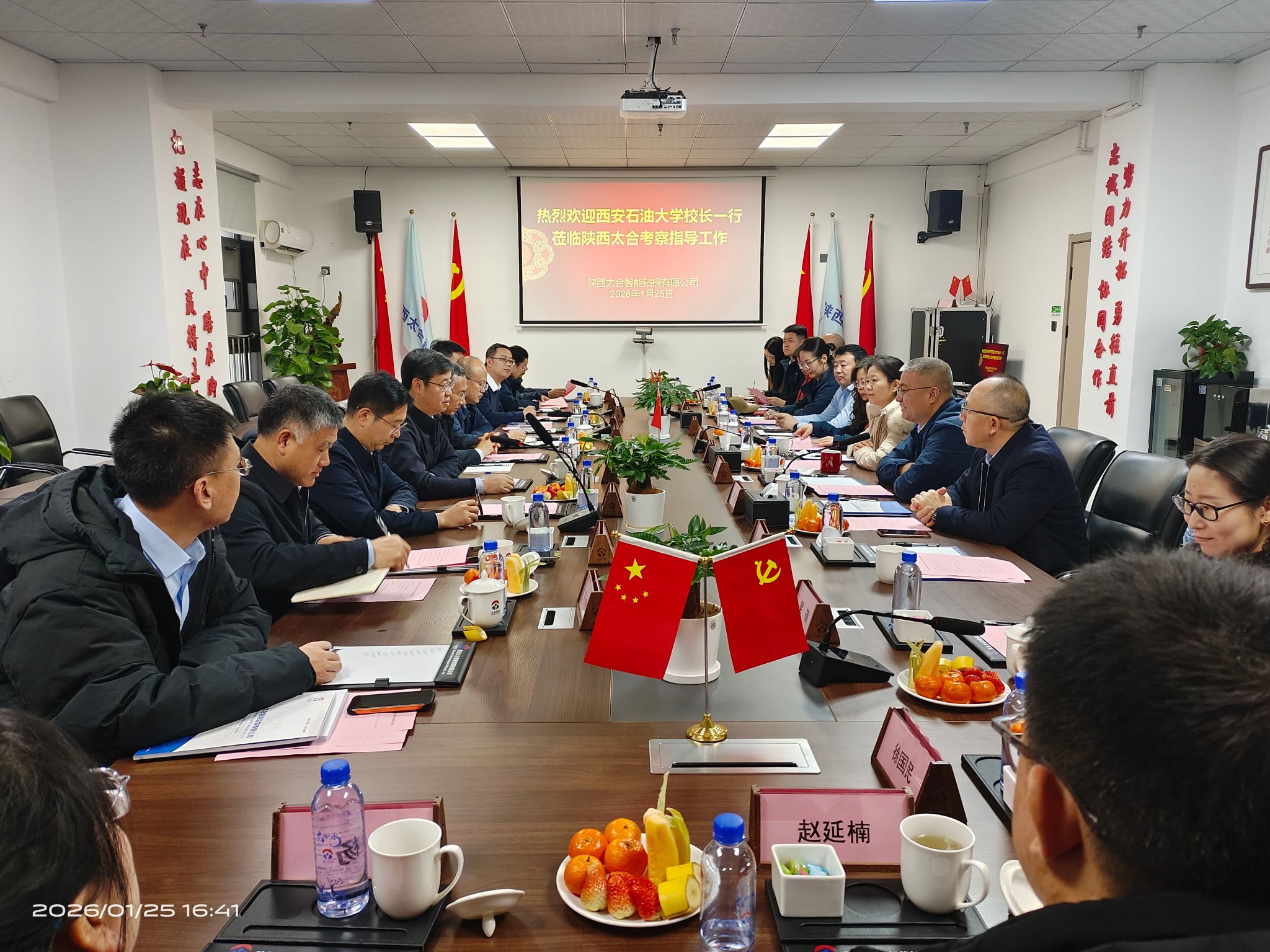 1月25日下午,校长王进富带队赴陕西太合智能钻探有限公司(以下简称“公司”)交流访问。校党委副书记张木,学校校友企业家联合会会长、重庆智展齿轮传动有限公司董事长何荣(beat365官网化机专业1992届校友)陪同走访。公司董事长王义红、财务总监李欢(beat365官网会计学专业2009届校友)及有关部门负责同志出席座谈会。双方围绕服务国家能源安全战略、深化产学研深度融合等议题深入研讨。