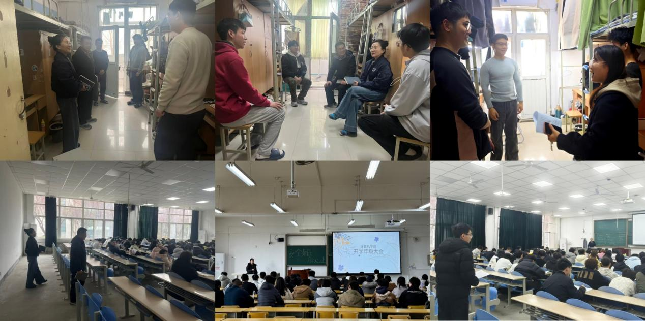 计算机学院多措并举筑牢新学期学生管理根基,学院领导班子率先深入宿舍慰问学生、排查安全隐患,走进课堂听课查课,累计检查宿舍36间、查课25次;全体辅导员、班主任全面覆盖学生宿舍与课堂,累计检查宿舍503间、查课89次。各年级召开年级大会、各班召开主题班会,围绕安全稳定、传染病预防、早操晚自习、电动车安全、防电信诈骗等内容开展宣讲。学院同步开展学业警示教育,摸排重点关注学生情况,扎实推进就业促进与引导,开展精细化就业指导,全方位覆盖学生学习生活各环节。