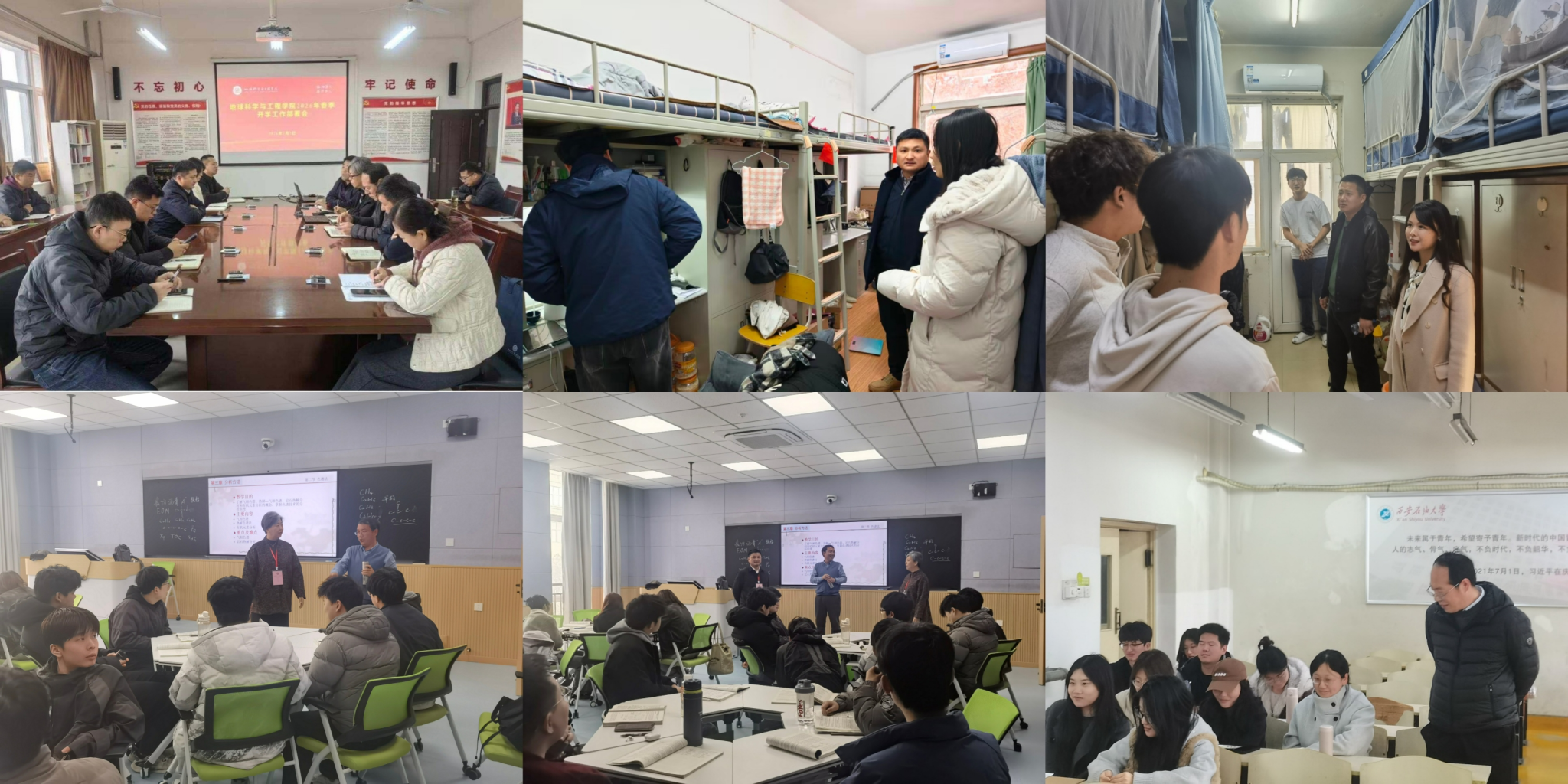 地球科学与工程学院以保障开学工作有序推进为目标,3月2日召开新学期工作部署会,对学院新学期各项工作进行再动员、再部署。学院领导班子深入学生宿舍、教室、实验室和职工之家,实地了解教师上课状况,检查学生返校报到、课堂出勤与学习状态,听取师生意见建议,全面了解新学期开学运行情况,确保教学秩序平稳有序。3月4日学院全体学工干部会上,就队伍作风建设、学生思想教育、校园安全稳定、学生就业考研、企业导师聘任及深入宿舍和课堂等工作作了强调和要求,辅导员通过组织学生签到、深入课堂和宿舍等方式,了解学生思想情况和上课状态,结合上学期成绩状况,有针对性地开展教育引导;走访过程中,毕业班辅导员结合个人发展意愿与当前就业形势,并就岗位信息对接等方面提出指导建议,切实助力毕业生实现高质量就业。各年级通过召开年级大会、主题班会等形式,开展内容丰富、形式多样的主题教育活动。本科生导师面对面交流、企业导师聘任等工作有序推进、落地见效。学生参与学科竞赛热情高涨,学院整体育人工作氛围浓厚向上。