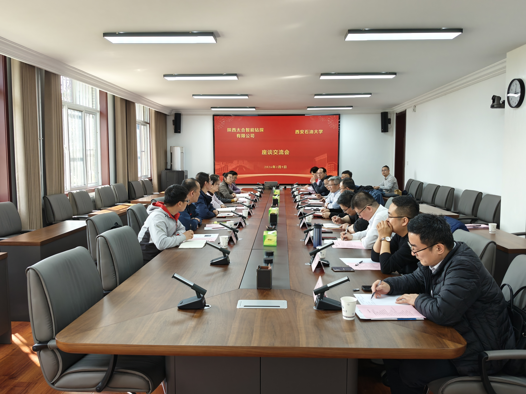 张骁勇代表学校对李欢一行来访表示欢迎,对陕西太合智能钻探有限公司长期以来给予学校建设发展的支持表示感谢,对公司近年来取得的显著成绩给予高度赞赏。他指出,近年来学校始终坚持开放办学理念,紧扣行业产业发展需求,深化产教融合、凝聚办学优势、聚焦企业痛点,围绕人才培养、科学研究、社会服务三大核心职能,与行业企业开展全方位、深层次、高水平合作,推动校企协同发展走深走实。今年2月14日校企战略合作协议的签署,是双方立足国家能源安全战略高度、把握产业发展新机遇、顺应产教融合新趋势的重要举措,为后续深度合作奠定了坚实基础。他表示,学校将以此次座谈为契机,坚持以合作促发展、以创新破难题、以实干赢未来,充分发挥自身学科特色、科研实力和人才优势,与企业精准对接、深度融合、同向发力、协同攻坚,全力推动战略合作协议各项内容落地生根、开花结果,着力打造产学研用一体化合作典范,为保障国家能源安全、推动企业转型升级、助力区域经济高质量发展贡献西石大智慧与力量。针对下一步工作,他对学校相关部门提出三点要求:一是要将战略合作内容逐项拆解、细化落实,明确工作方案、划定时间节点、绘好作战蓝图,建立常态化跟踪推进机制,精准找准合作切入点和突破口,确保各项合作任务有序推进;二是要打破传统“单兵作战”模式,转向校企协同“兵团作战”,健全常态化交流对接机制,紧密结合公司实际需求主动作为,打破学院、学科壁垒,扎实开展有组织科研,提升合作实效;三是要推动协议条款转化为校企利益共同体,积极探索“太合出题、学校答题”的合作模式,构建利益共享、风险共担的协同发展机制,以最大诚意、最实举措,推动校企合作实现互利共赢、共同发展。