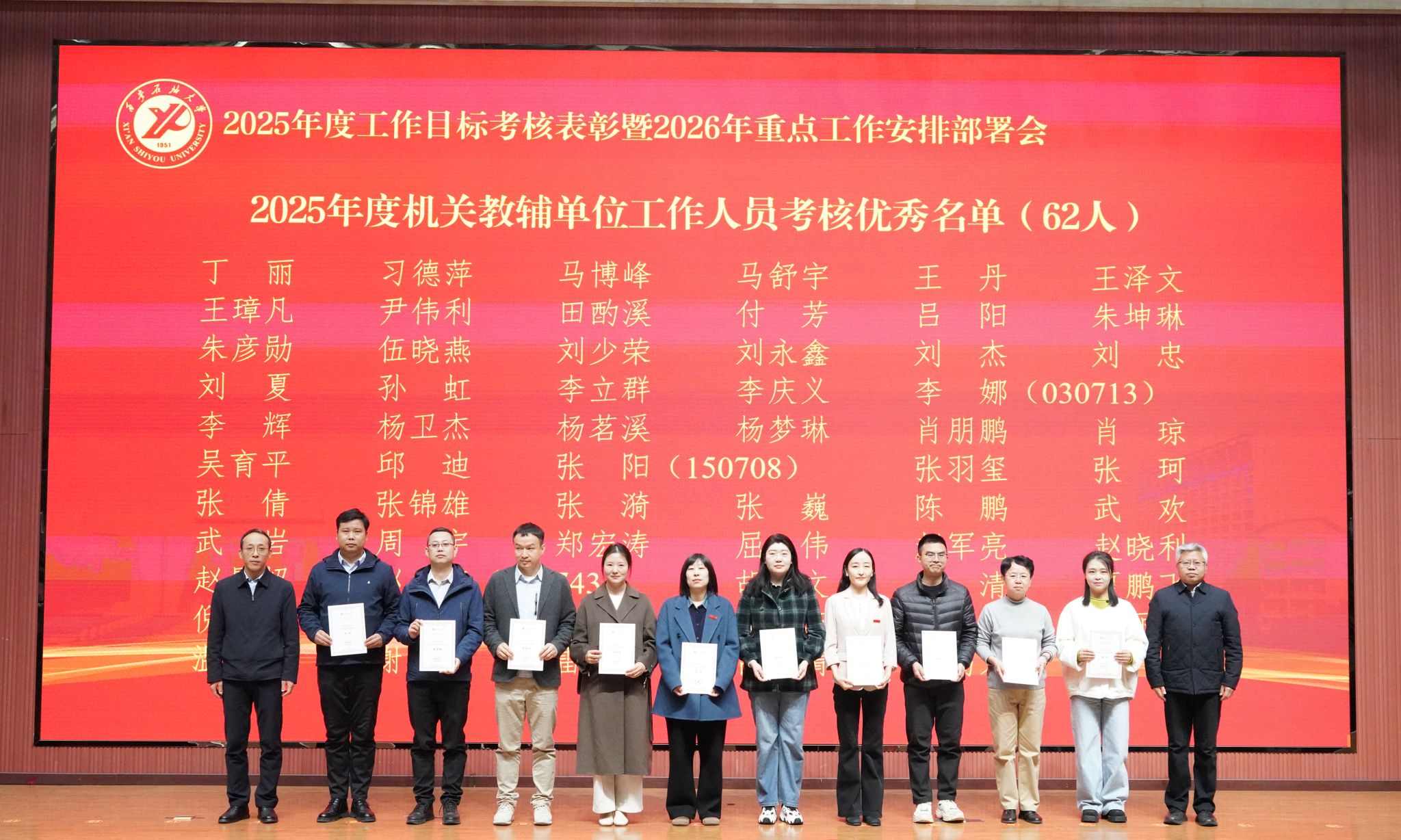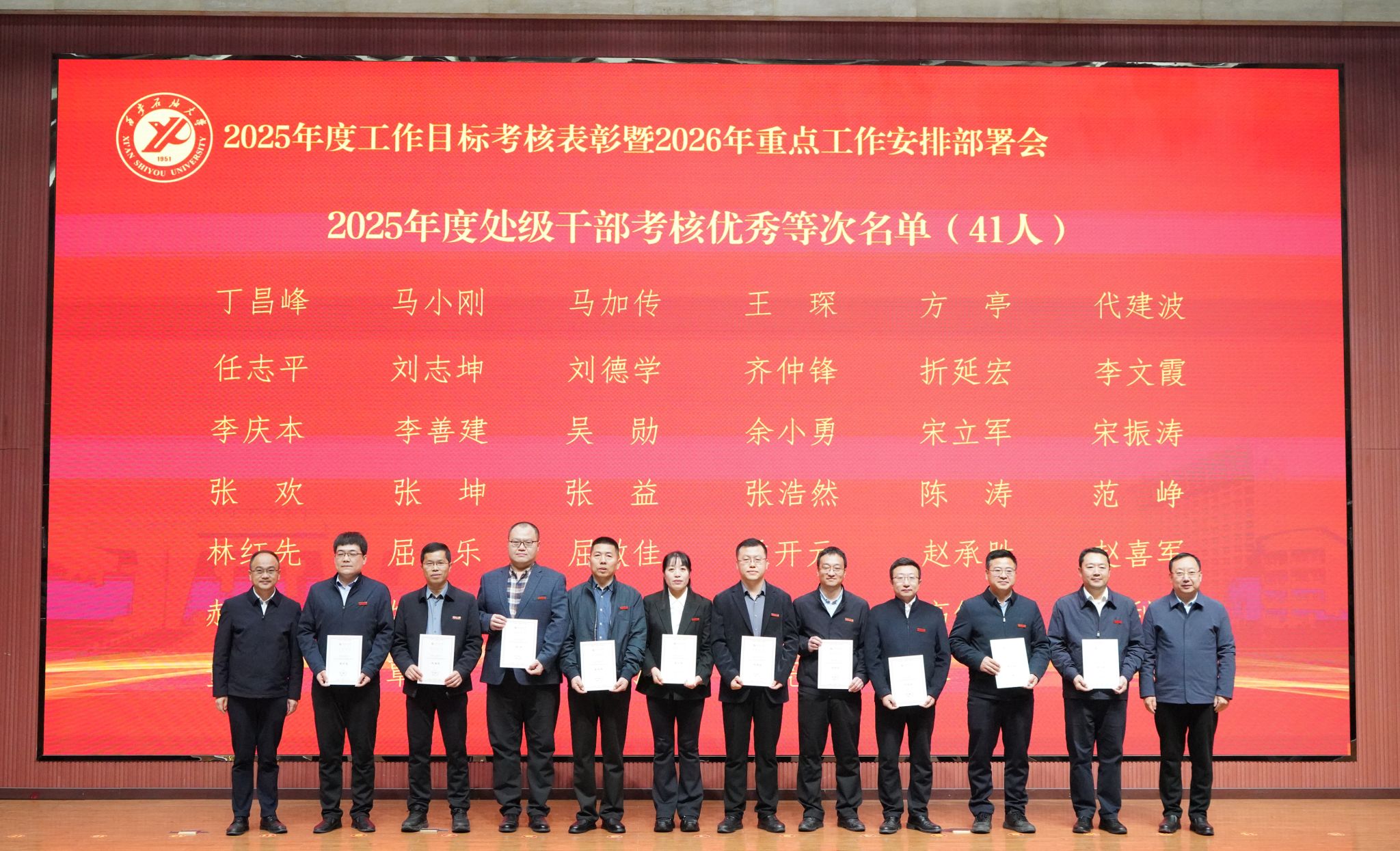 3月13日上午,学校在鄠邑校区弘石学术报告厅召开2025年工作目标考核表彰暨2026年重点工作安排部署会。全体校领导,校学术委员会委员,二、三级教授,全体处级干部,学科带头人,各院(系)系(教研室)主任、综合办公室主任,全体学工干部,离退休职工代表、学生干部代表,考核优秀集体、优秀个人代表在主会场参会;来自全校各院系的100余名学生代表在鄠邑校区第一会议室分会场参会。校党委副书记张木主持会议。