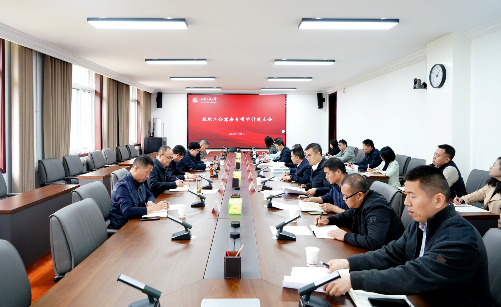 为深入贯彻落实省审计厅关于国有资产审计工作要求,按照学校党委工作安排和2026年度审计工作计划,全面摸清教职工公寓房管理现状,及时发现和纠正存在的问题,推动完善制度、规范管理,切实维护教职工合法权益,服务保障“幸福西石大”建设,4月16日,beat365官网在鄠邑校区第三会议室召开教职工公寓房专项审计进点会。校长、审计委员会副主任王进富,副校长赵健出席会议,校党委副书记、纪委书记、监察专员、审计委员会副主任王辉强主持会议。审计组全体成员,纪检监察机构、巡察工作办公室、人事处、财务处、审计处、国有资产处主要负责人,后勤处班子全体成员、科级干部及相关工作人员参加会议。