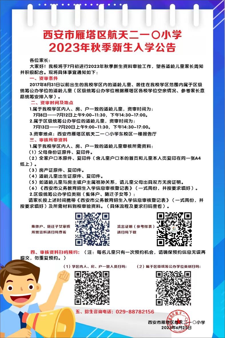 大家好!根据西安市雁塔区航天二一〇小学对辖区内适龄儿童2023年秋季新生入学的通知安排,现将入学公告公布如下,请各位家长提前准备资料,按时进行资料审验。