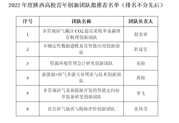 根据陕西省教育厅《关于2022年度陕西高校青年创新团队申报工作的通知》要求,经院(系)推荐、科技处审查、学校组织专家组评审等程序,拟推荐赵金省、折延宏、吴勋、黄海、李飞、张凤奇6人申报2022年度陕西高校青年创新团队,现予以公示(名单附后)。