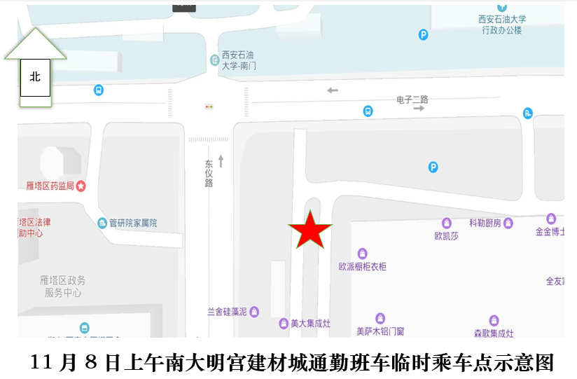 当天需要乘车前往鄠邑校区的教职工,请提前20分钟步行至南大明宫建材城停车场内西北角乘车(具体位置见附图中五角星标示处),车牌号码:陕AA466Z、陕AA45Z、陕AKH787;车辆特征:均为白色9座面包车,司机联系电话:苏师傅13992828618,付师傅13991300748,蒲师傅18992839379。