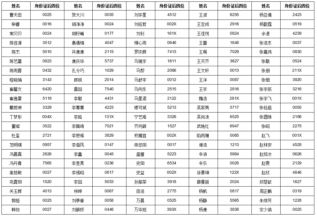 经学校人事代理人员招聘统一笔试,以下人员进入专业技能测试考核环节,现将人员名单及身份证号后四位公示如下(按姓氏拼音排序):