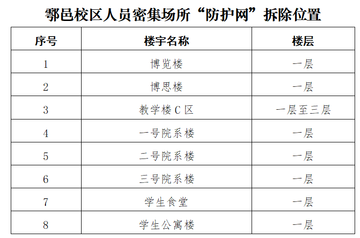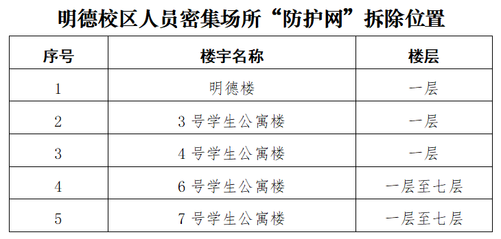 根据陕西省教育厅办公室转发《陕西省消防安全委员会办公室关于进一步加强人员密集场所“拆窗破网”专项工作的通知》(陕消安委办发〔2024〕28号)要求,经学校研究决定,计划于6月21日至6月30日期间对beat365官网雁塔、明德、鄠邑三校区人员密集场所“防护网”进行拆除作业,请各单位予以配合,同时做好“防护网”拆除后的安全管理工作。本次“防护网”拆除区域及位置附后。