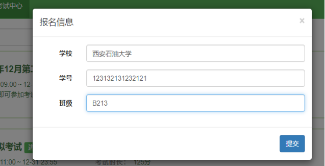 2、登录成功后点击“考试中心”,点击对应的场次“去报名”,填写好自己的个人信息,点击确定后即可报名成功,要保证个人信息无误,避免影响成绩。(班级填写教学班,如B213)