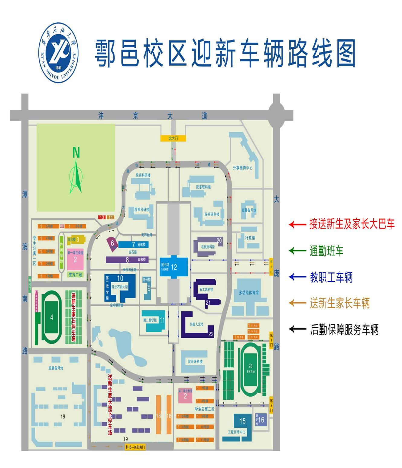 (4)学生家长车辆,东大门进入,右拐(向北)沿环道单向行驶,严禁反向行驶,由东环道-北环道-西环道逆时针行驶,停于西区篮球场停车点以及教职工C1-C4公寓地下停车场。由科技一条街南门驶出。