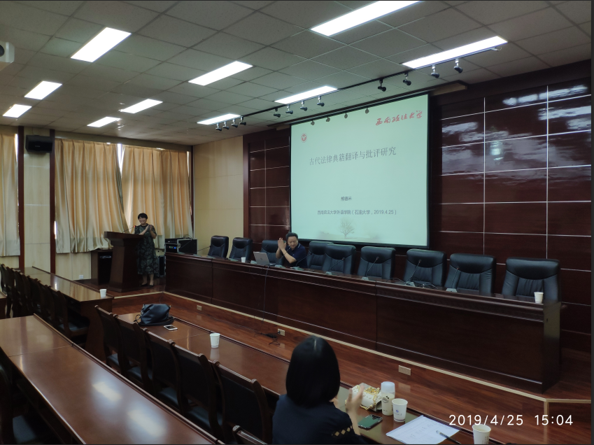 熊教授为在场师生详细介绍了当前古代法律典籍翻译的现状,着重阐述了“走出去”的法律典籍观。熊教授强调,做翻译研究要能坐得住“冷板凳”,要走“少有人走的路”,多读书多做翻译实践,才能在某一领域内有所建树。此外,熊教授还为正在申请课题的老师们提出了诸多切实有效的建议。