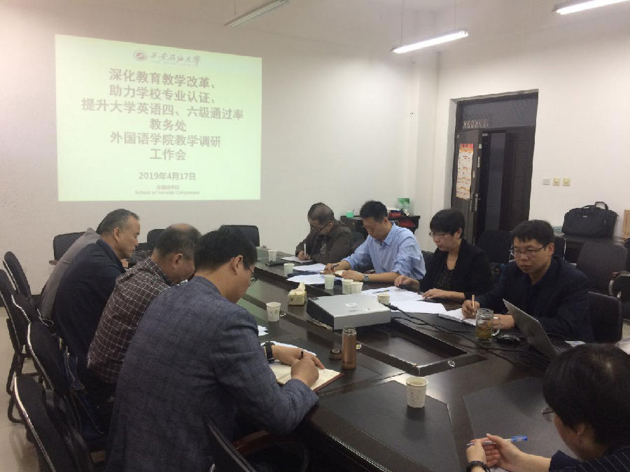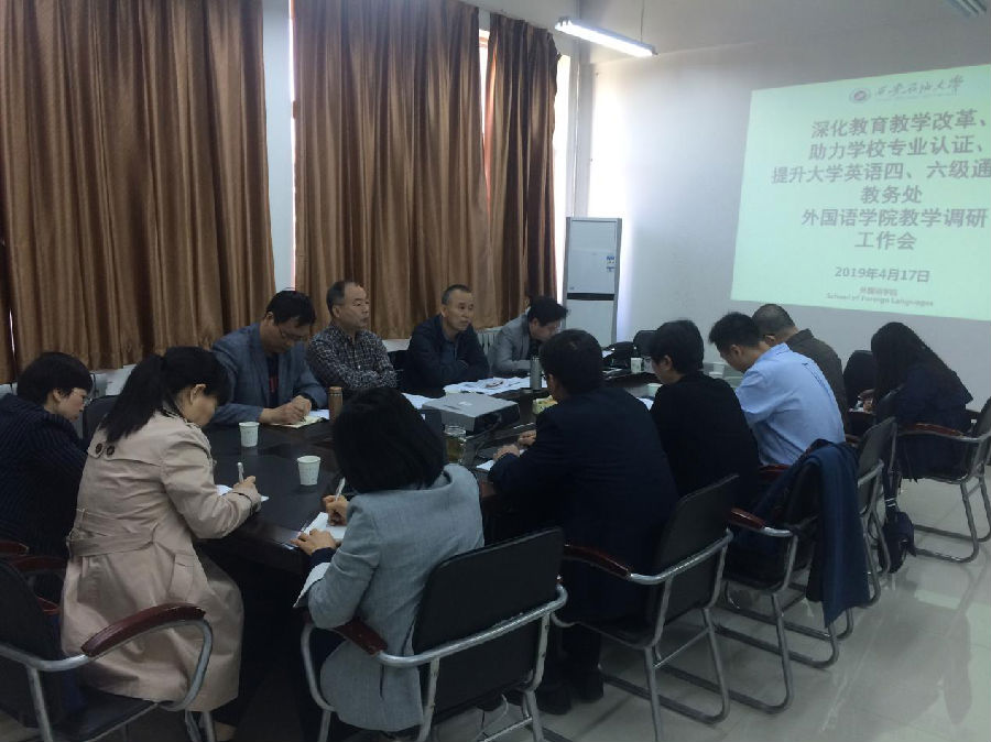 陈校长一行听取了外国语学院院长于艳英教授关于外国语学院大学英语教学改革等方面的工作汇报。于院长通过数据总结了大学英语教学改革的初步成效,并提出建立学院教师考评机制和激励机制,以此推动大学英语四六级成绩的提升,同时希望教务处能在大学英语教学改革及实验室建设等方面给予外国语学院更大的支持。